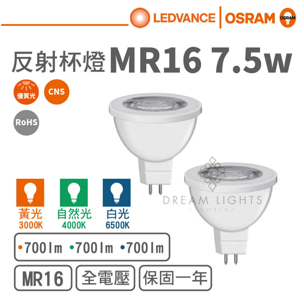 【歐司朗 OSRAM】LED MR16/7.5W直壓反射型杯燈(黃光/自然光/白光)【實體門市保固一年】MR16杯燈3000K 黃光|4000K 自然光|6500K 白光DREAM LIGHTS 築光燈飾