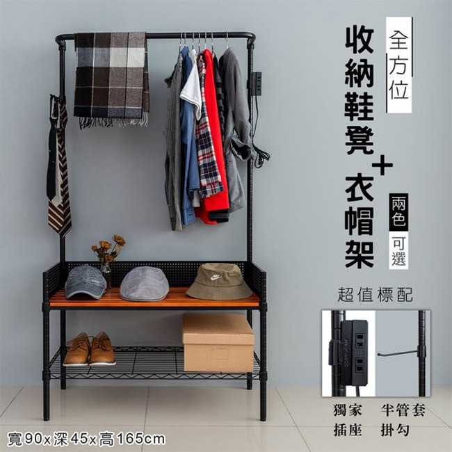 dayneeds 全方位收納90x45x165cm鞋凳衣帽架(兩色)玄關架 層架 置物架 鐵架 收納層架 鐵力士架 收納黑色+原木|黑色+柚木|白色+原木|白色+柚木Hangers & Pegsdayneeds收納生活館