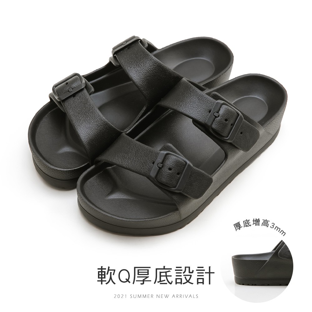 FM SHOES MIT雙釦厚底休閒拖鞋 涼鞋 防水 拖鞋 防滑拖 海灘鞋 室內拖鞋 增高 黑黑36|黑37|黑38|黑39|黑40|黑41Flat SandalsFM shoes 流行女鞋第一首選!快速出貨 |免運費