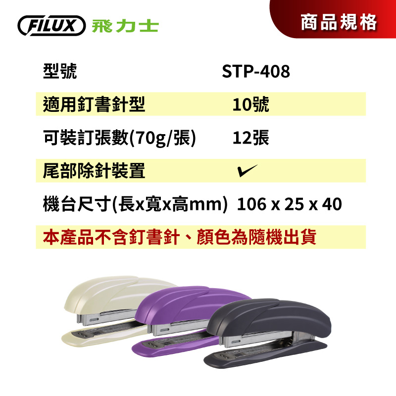 【驚喜最超值】FILUX 飛力士 省力PLUS輕巧10號釘書機 STP-408 (3色隨機出貨)