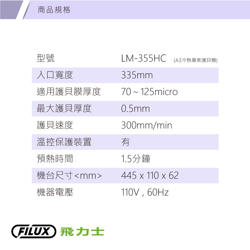 【FILUX 飛力士】 A3 冷熱專業護貝機 LM-355HC 薰衣草配色 (加贈圓角器)【FILUX 飛力士】 A3 冷熱專業護貝機 LM-355HC 薰衣草配色 (加贈圓角器)OthersFILUX 飛力士