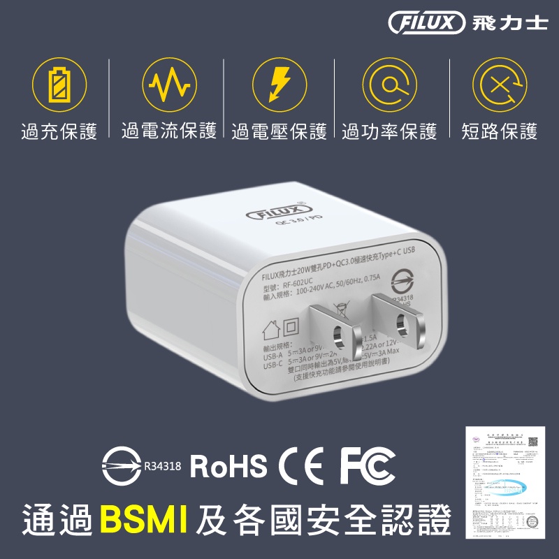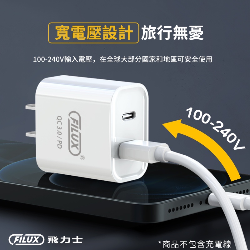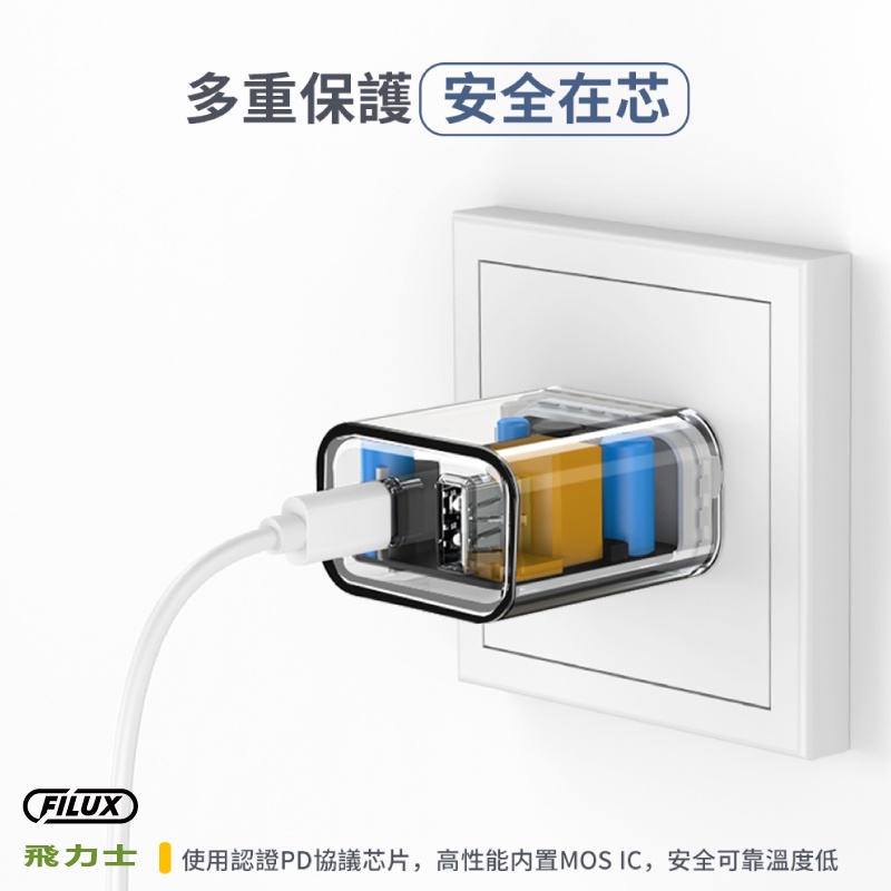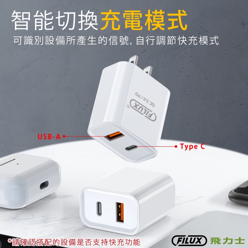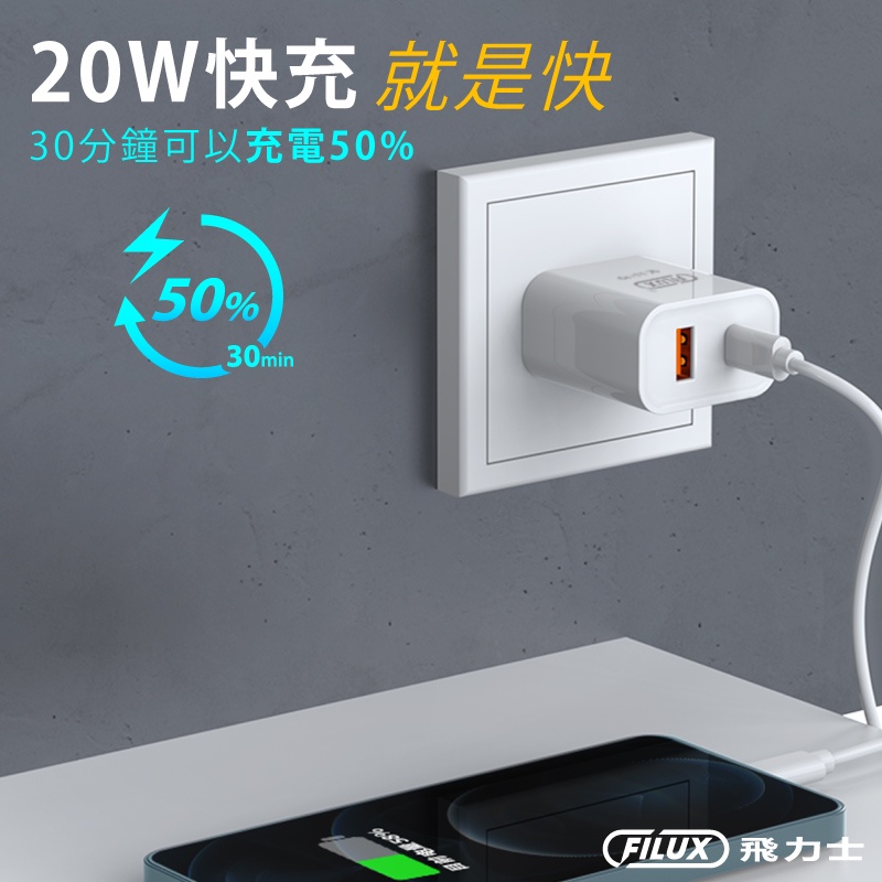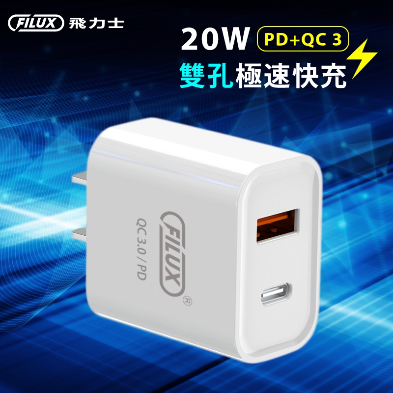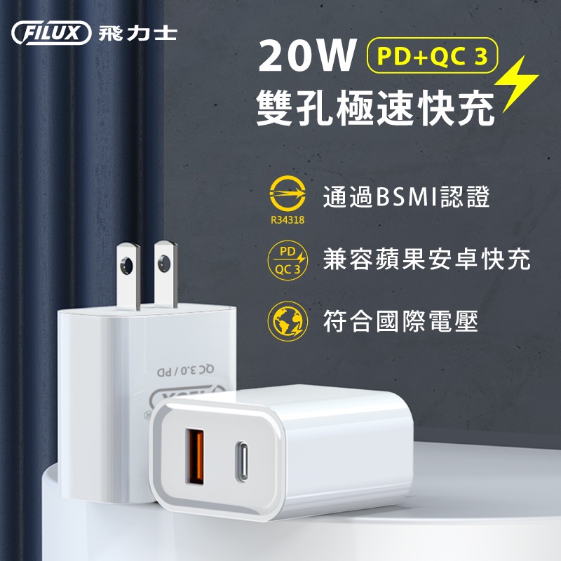 FILUX 飛力士 20W雙孔PD QC3.0 極速快充 Type-C USB BSMI認證 [原廠]1入|2入Cables, Chargers & ConvertersFILUX 飛力士