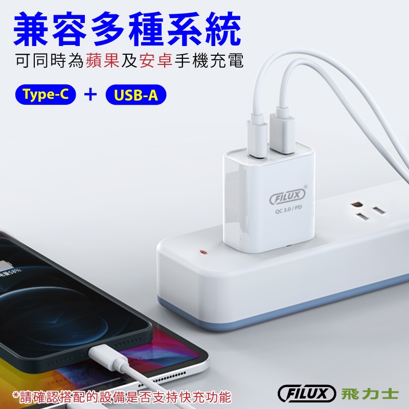 FILUX 飛力士 20W雙孔PD QC3.0 極速快充 Type-C USB BSMI認證 [原廠]