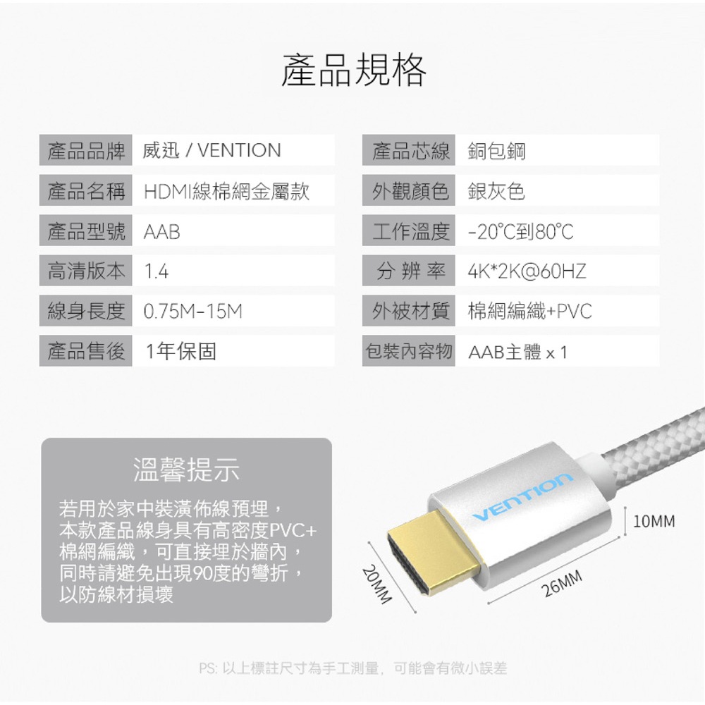 VENTION 威迅 HDMI 4K高畫質影音傳輸線 1-5M 抗氧化鍍金接頭 HDMI協會會員,HDCP標準協議保護1M (AAB系列)|2M (AAB系列)|5M (AAB系列)cudy丨bitro線上旗艦店