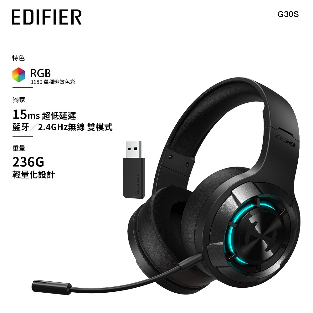【EDIFIER】G30S 超低延遲雙模電競耳麥耳罩式 搭配無線發射器DONGLE 麥克風抗噪 HECATE電競系列黑色|灰色EDIFIER 官方旗艦店