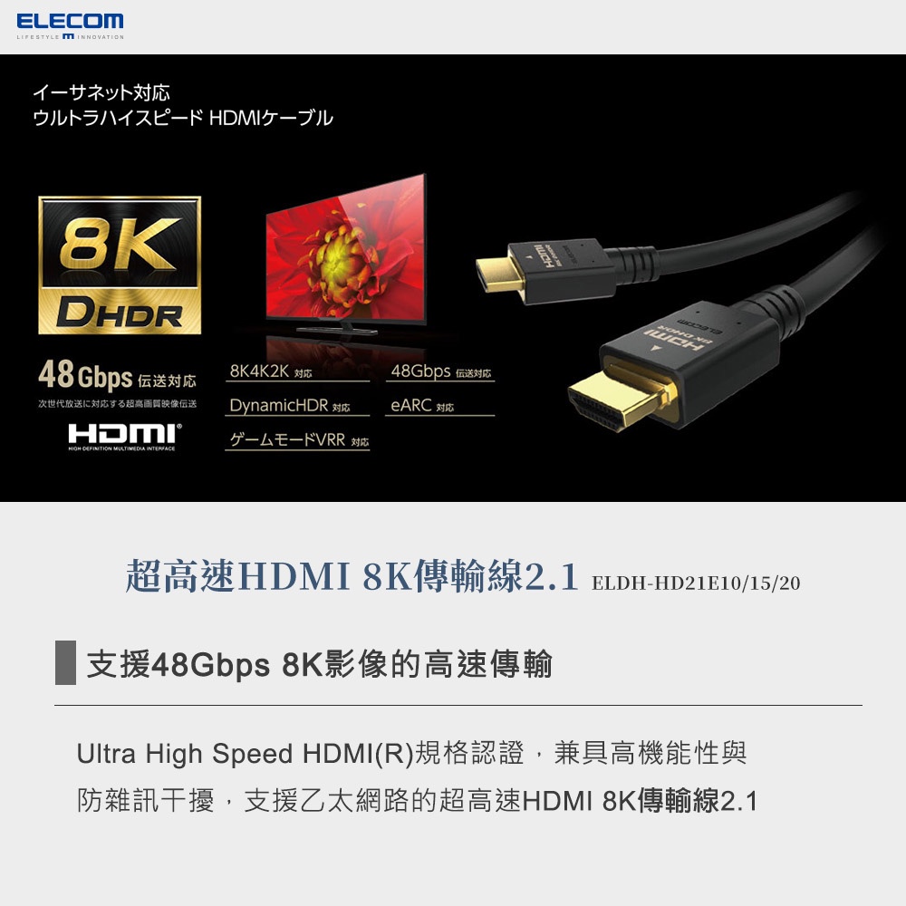 【日本ELECOM】超高速HDMI 8K傳輸線2.1 2M DHDR 8K/4K/2K【日本ELECOM】超高速HDMI 8K傳輸線2.1 2M DHDR 8K/4K/2KELECOM 台灣旗艦店
