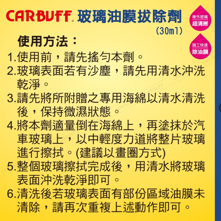 CARBUFF 玻璃油膜拔除劑 30ml 《贈送專用海綿》MH-8902 玻璃除油膜 玻璃清潔CARBUFF 玻璃油膜拔除劑 30ml 《贈送專用海綿》MH-8902 玻璃除油膜 玻璃清潔Glass Care & Water RepellentsCARBUFF 車痴汽車用品