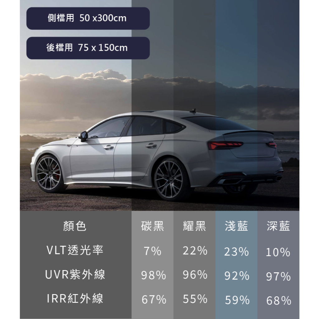 【Car Life】DIY靜電隔熱膜(整捲)|遮陽 阻隔UV與紅外線 強化隔熱效果|熱銷海外炭黑 透光率 7%,側窗用 50 x 300 cm|炭黑 透光率 7%,後擋用 75 x 150 cm|深藍 透光率 10%,側窗用 50 x 300 cm|深藍 透光率 10%,後擋用 75 x 150 cm|淺藍 透光率 23%,側窗用 50 x 300 cm|淺藍 透光率 23%,後擋用 75 x 150 cm|淺黑 透光率 22%,側窗用 50 x 300 cm|淺黑 透光率 22%,後擋用 75 x 150 cmSun Shields & Dash CoversCarlife 汽車隔熱生活