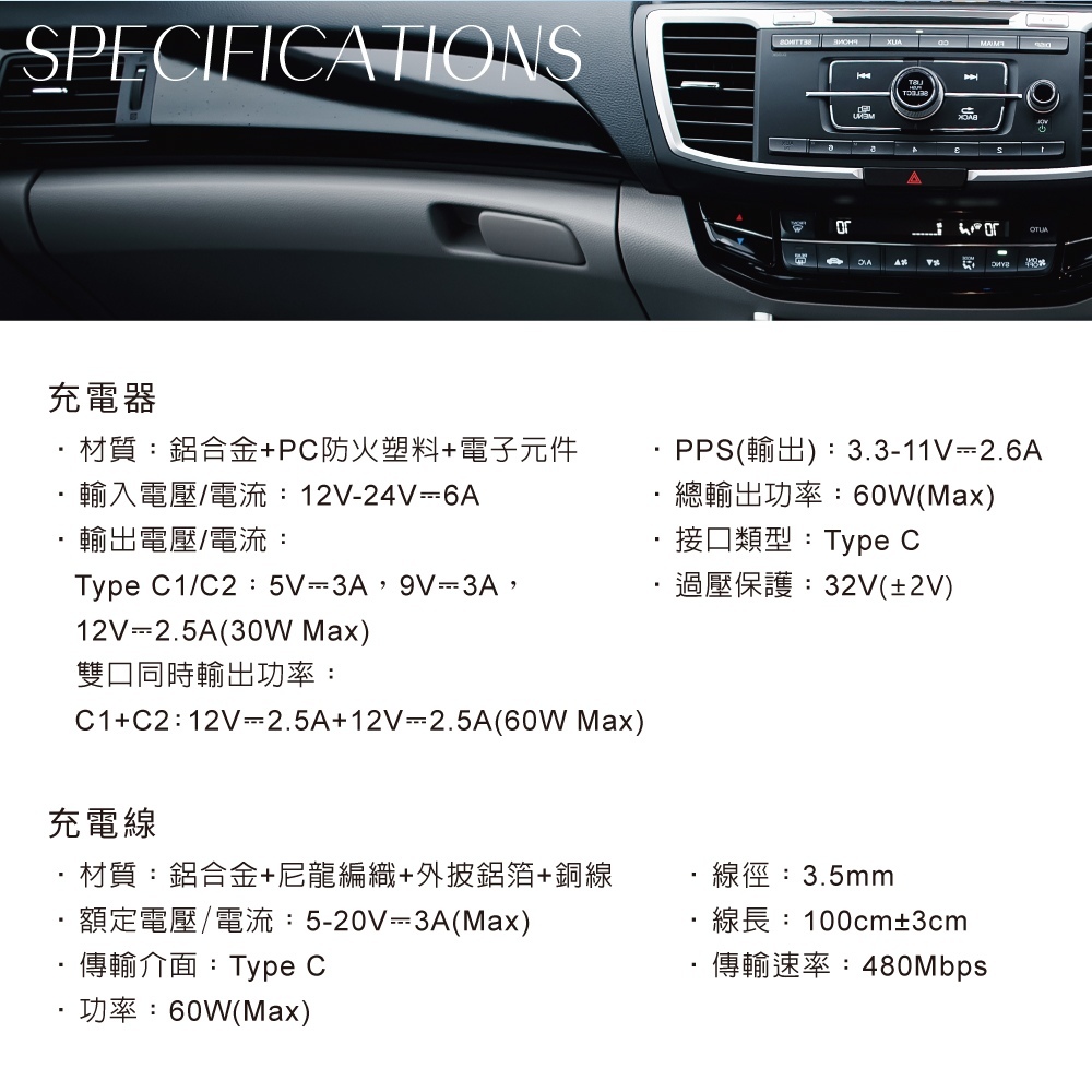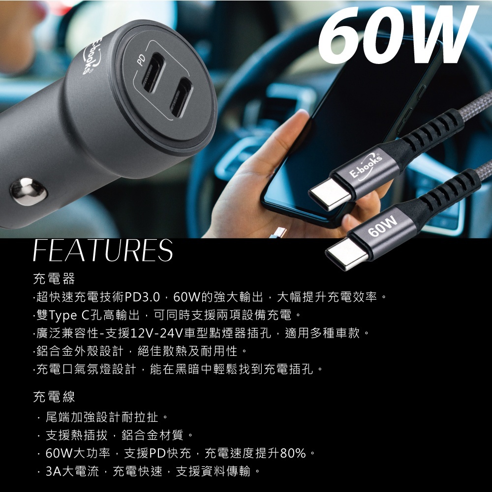 E-books B87 車用60W鋁合金雙PD 3.0+60W C to C 快充傳輸線組E-books B87 車用60W鋁合金雙PD 3.0+60W C to C 快充傳輸線組USB Chargers, FM & Bluetooth TransmittersE-books 官方旗艦店