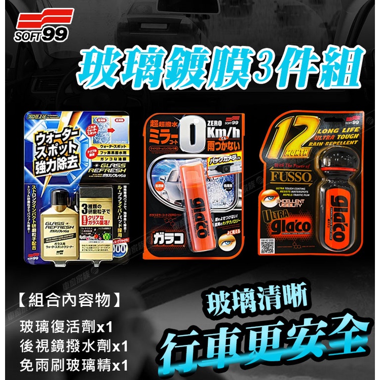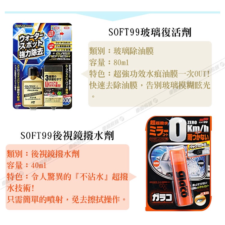 日本SOFT99 玻璃鍍膜3件組《玻璃復活劑+後視鏡撥水劑+超級免雨刷》玻璃除油膜+撥水劑C299 C297 C236日本SOFT99 玻璃鍍膜3件組《玻璃復活劑+後視鏡撥水劑+超級免雨刷》玻璃除油膜+撥水劑C299 C297 C236Glass Care & Water RepellentsCARBUFF 車痴汽車用品