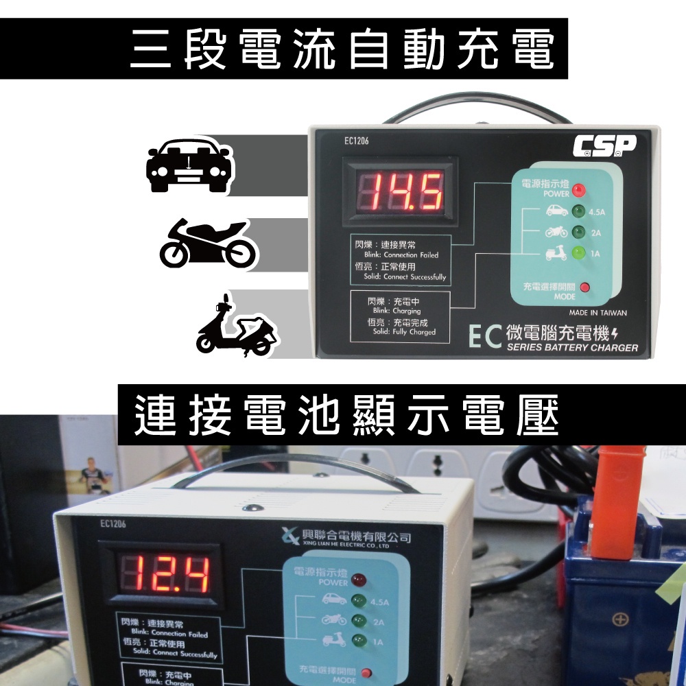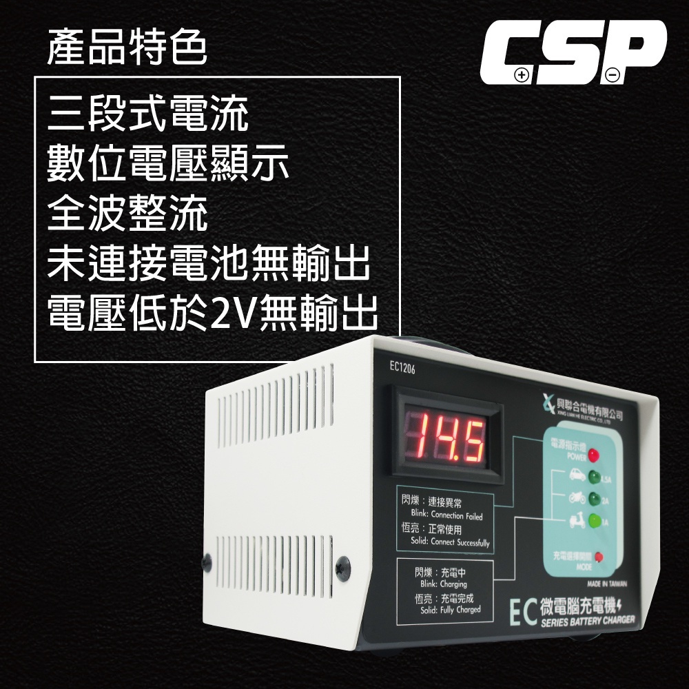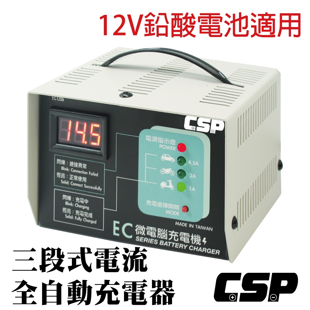 【CSP】12V鉛酸電池充電 三段式自動充電器 2年保固 台灣製造 汽車 機車 重機充電 EC-1206EC-1206|【超商限寄1組,超過請改寄宅配】ElectronicsCSP進煌 藍騎士 電池電瓶充電器 電瓶檢測器 膠體電池 太陽能電池