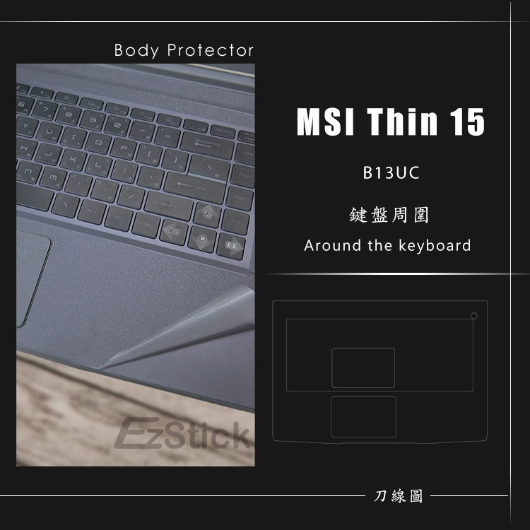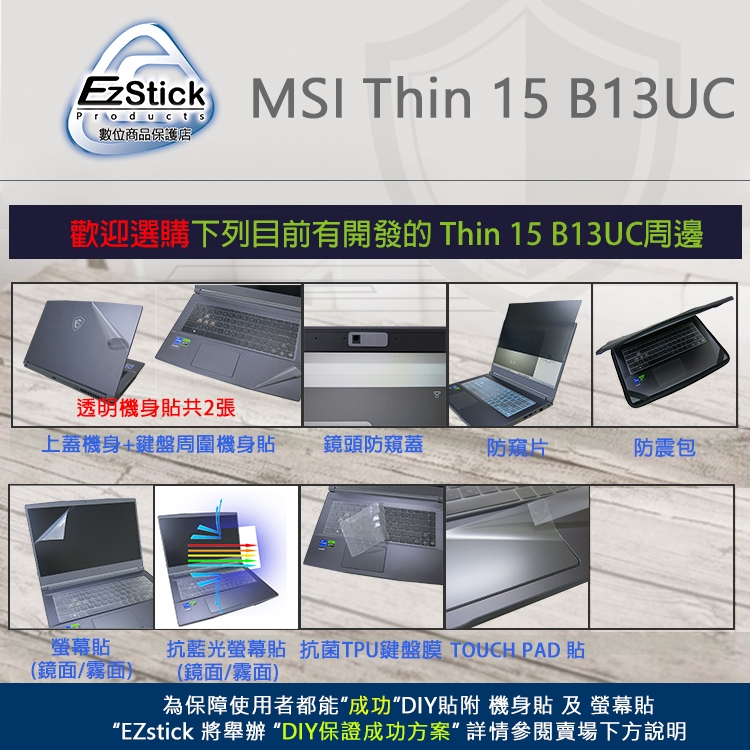 【Ezstick】MSI Thin 15 B12UC B13UC 筆電機身貼|霧面質感款|上蓋+鍵盤週圍貼|DIY 包膜機身貼+筆電超細纖維布331*230mm|抗菌TPU鍵盤膜-單購|三合一防震包組|機身貼+觸控板貼|機身貼(含上蓋+鍵盤週圍貼)共二張|鏡面螢幕貼(加購價)-單購|霧面螢幕貼(加購價)-單購|抗藍光鏡面螢幕貼(加購價)-單購|抗藍光霧面螢幕貼(加購價)-單購|抗藍光防窺片(左右防窺)-單購|抗藍光防窺片(360度防窺)-單購Laptop Skins & CoversEZstick 3C商品保護賣場