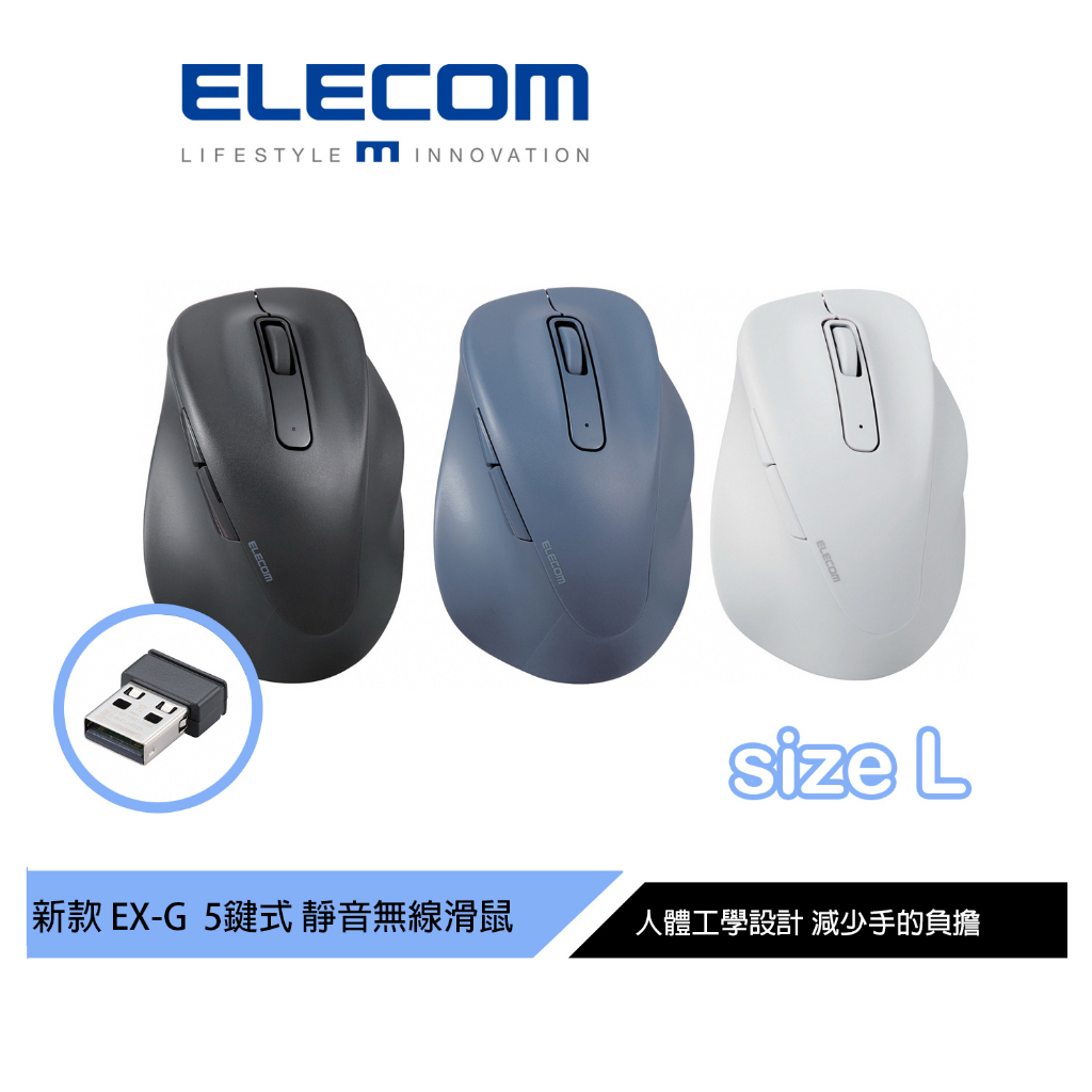 【日本ELECOM】 EX-G人體工學 無線靜音5鍵式滑鼠L 黑/藍/白 適合大手型 減少手腕負擔黑|藍|白MiceELECOM 台灣旗艦店