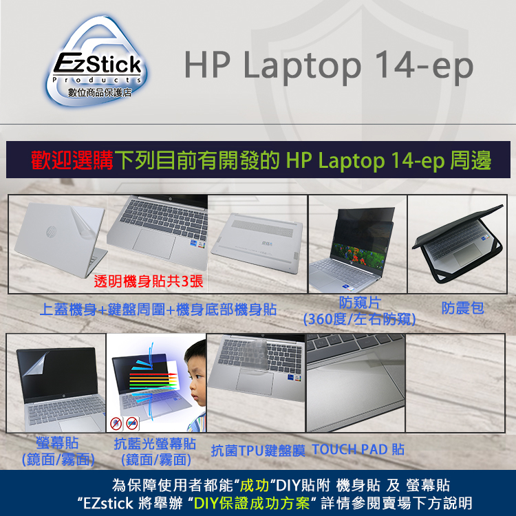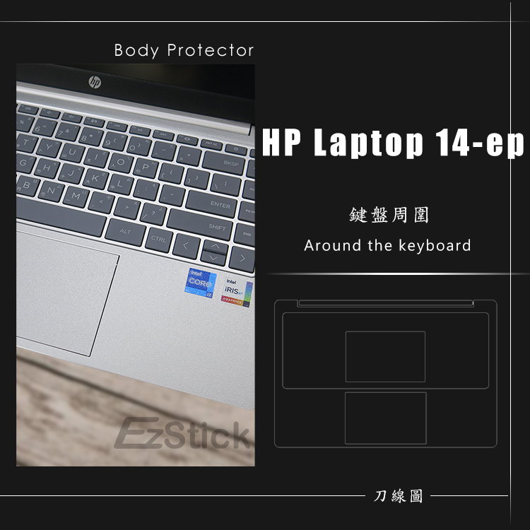 【Ezstick】HP Laptop 14-ep 14-ep0065TU 機身保護貼 (含上蓋+鍵盤週圍+底部貼)共三張霧面螢幕貼(加購價)-單購|抗藍光鏡面螢幕貼(加購價)-單購|抗藍光霧面螢幕貼(加購價)-單購|抗藍光防窺片(左右防窺)-單購|抗藍光防窺片(360度防窺)-單購|機身貼(含上蓋+鍵盤週圍+底部貼)共三張|鏡面螢幕貼(加購價)-單購|抗菌TPU鍵盤膜-單購|機身貼+觸控板貼|機身貼+筆電超細纖維布285*196mmLaptop Skins & CoversEZstick 3C商品保護賣場