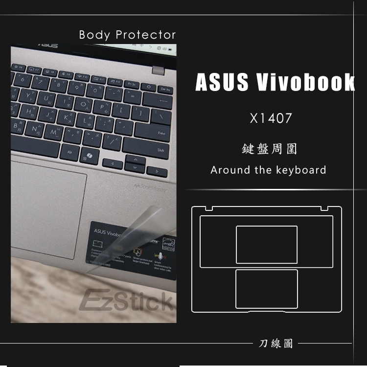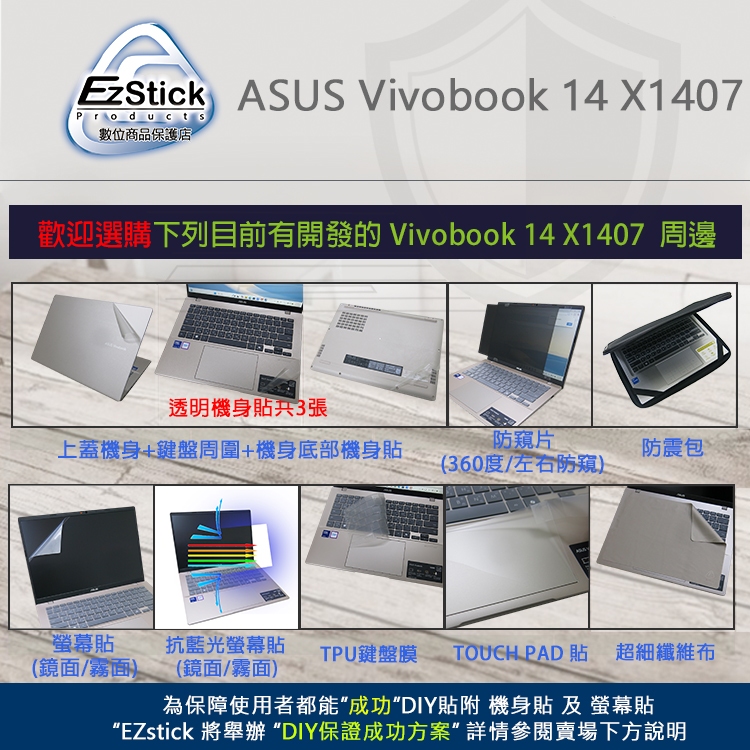 【Ezstick】ASUS Vivobook 14 X1407 X1407CA 機身貼 (上蓋+鍵盤週圍+底部貼)鏡面螢幕貼(加購價)-單購|霧面螢幕貼(加購價)-單購|抗藍光鏡面螢幕貼(加購價)-單購|抗藍光霧面螢幕貼(加購價)-單購|抗藍光防窺片(左右防窺)-單購|抗藍光防窺片(360度防窺)-單購|機身貼+觸控板貼|機身貼+筆電超細纖維布285*196mm|抗菌TPU鍵盤膜-單購|機身貼(含上蓋+鍵盤週圍+底部貼)共三張OthersEZstick 3C商品保護賣場