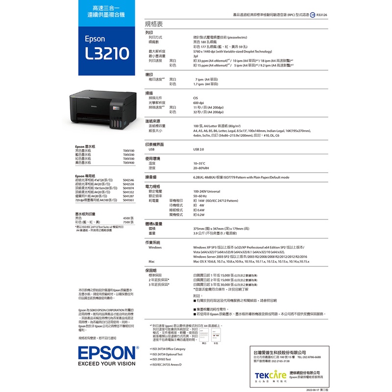 EPSON L3210 高速三合一 連續供墨複合機原價4990(現省702) 公司貨EPSON L3210 高速三合一 連續供墨複合機原價4990(現省702) 公司貨Printers, Scanners & Photocopy MachinesEPSON 官方旗艦店