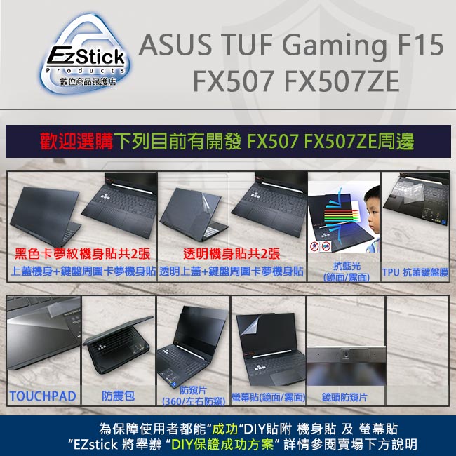 【Ezstick】ASUS TUF Gaming FX507 FX507ZE TPU鍵盤膜|奈米銀抗菌 防水可水洗抗菌TPU鍵盤膜|鏡面螢幕貼(加購價)-單購|霧面螢幕貼(加購價)-單購|抗藍光鏡面螢幕貼(加購價)-單購|抗藍光霧面螢幕貼(加購價)-單購|抗藍光防窺片(左右防窺)-單購|抗藍光防窺片(360度防窺)-單購|鍵盤膜+觸控板貼+施工刮板|鍵盤膜+筆電超細纖維布331*230mmKeyboard & Trackpad CoversEZstick 3C商品保護賣場