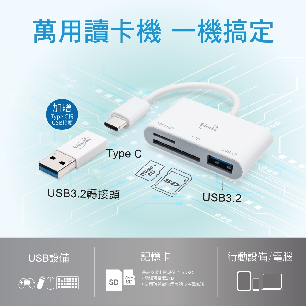 E-books T49 Type-C 三合一讀卡機+USB3.2 HUB 贈USB轉接頭E-books T49 Type-C 三合一讀卡機+USB3.2 HUB 贈USB轉接頭USB Hubs & Card ReadersE-books 官方旗艦店
