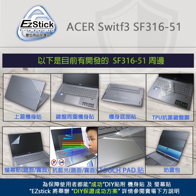 【Ezstick】ACER Switf3 SF316-51 TPU鍵盤膜|奈米銀抗菌|防水可水洗抗菌TPU鍵盤膜|鏡面螢幕貼(加購價)-單購|霧面螢幕貼(加購價)-單購|抗藍光鏡面螢幕貼(加購價)-單購|抗藍光霧面螢幕貼(加購價)-單購|抗藍光防窺片(左右防窺)-單購|鍵盤膜+觸控板貼+施工刮板|鍵盤膜+筆電超細纖維布331*230mm|抗藍光防窺片(360度防窺)-單購|機身貼(含上蓋+鍵盤週圍+底部貼)共三張Keyboard & Trackpad CoversEZstick 3C商品保護賣場