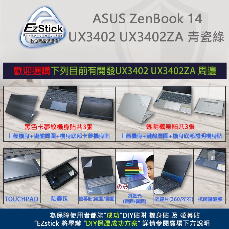 【Ezstick】ASUS UX3402 UX3402ZA 筆電機身貼|霧面質感款|上蓋+鍵盤週圍+底部貼|青瓷綠專用抗藍光防窺片(左右防窺)-單購|抗藍光防窺片(360度防窺)-單購|機身貼(含上蓋+鍵盤週圍+底部貼)共三張|鏡面螢幕貼(加購價)-單購|霧面螢幕貼(加購價)-單購|抗藍光鏡面螢幕貼(加購價)-單購|抗藍光霧面螢幕貼(加購價)-單購|機身貼+觸控板貼|機身貼+筆電超細纖維布285*196mm|抗菌TPU鍵盤膜-單購OthersEZstick 3C商品保護賣場