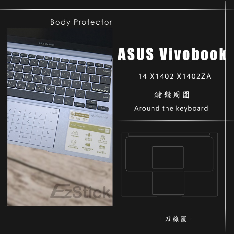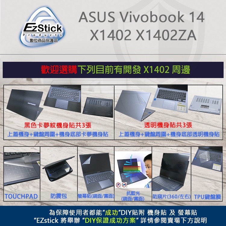 【Ezstick】ASUS X1402 X1402ZA 筆電機身貼|霧面質感款|上蓋+鍵盤週圍+底部貼|冰河銀專用鏡面螢幕貼(加購價)-單購|霧面螢幕貼(加購價)-單購|抗藍光鏡面螢幕貼(加購價)-單購|抗藍光霧面螢幕貼(加購價)-單購|抗藍光防窺片(左右防窺)-單購|抗藍光防窺片(360度防窺)-單購|機身貼(含上蓋+鍵盤週圍+底部貼)共三張|機身貼+觸控板貼|機身貼+筆電超細纖維布285*196mm|抗菌TPU鍵盤膜-單購OthersEZstick 3C商品保護賣場