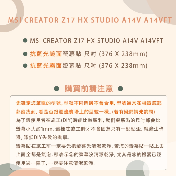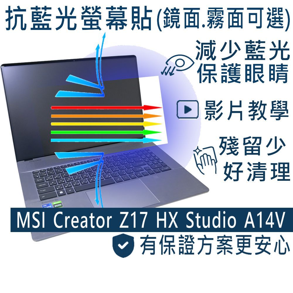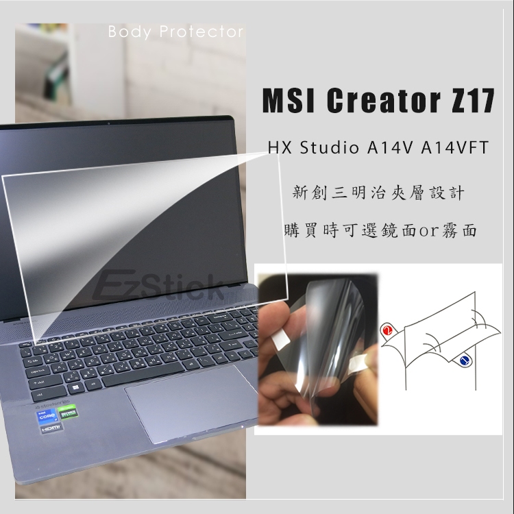【Ezstick】MSI Creator Z17 HX A14V A14VFT 防藍光螢幕貼 抗藍光 (可選鏡面或霧面)抗藍光鏡面螢幕貼(有邊框)367×230|抗藍光霧面螢幕貼(有邊框)367×230|抗藍光鏡面螢幕貼(無邊框)376*238|抗藍光霧面螢幕貼(無邊框)376*238Laptop Skins & CoversEZstick 3C商品保護賣場