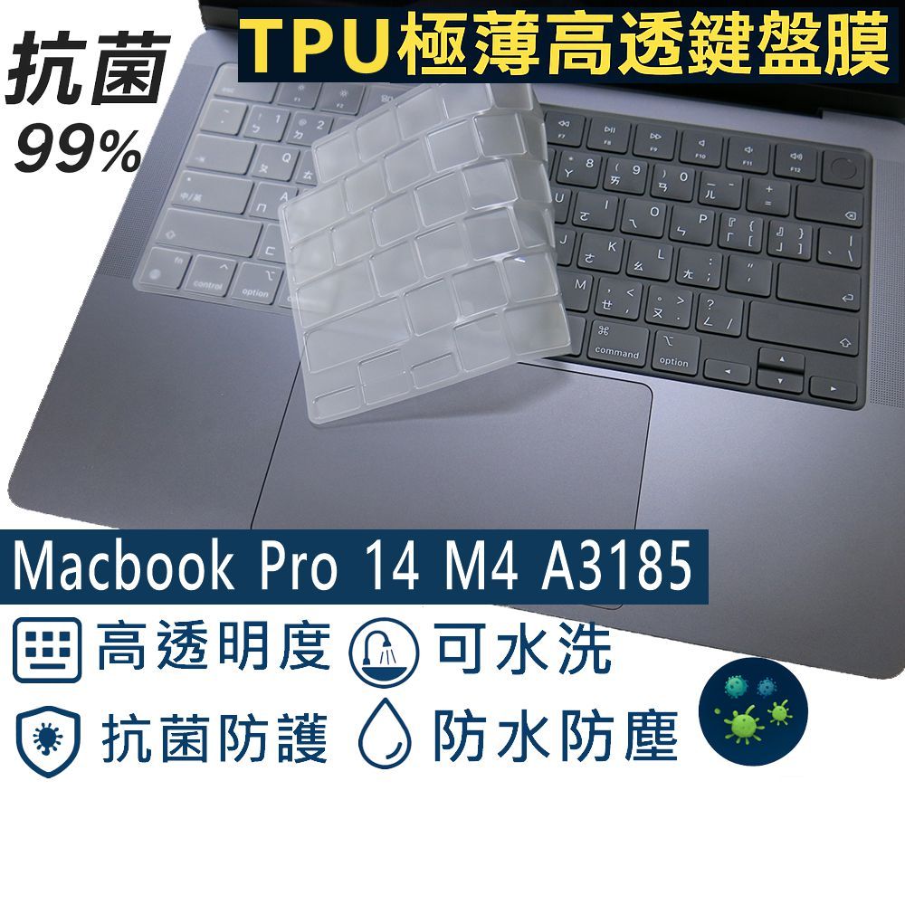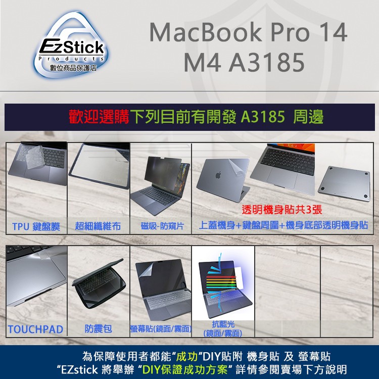 【Ezstick】MacBook Pro 14 M4 A3185 奈米銀抗菌TPU 鍵盤保護膜 鍵盤膜抗菌TPU鍵盤膜|抗藍光亮面螢幕貼-單購|磁吸式抗藍光防窺片-單購|鍵盤膜+筆電超細纖維布285*196mm|鍵盤膜+觸控板貼+施工刮板|透明霧面機身貼 含上蓋+鍵盤週圍+底部貼Keyboard & Trackpad CoversEZstick 3C商品保護賣場