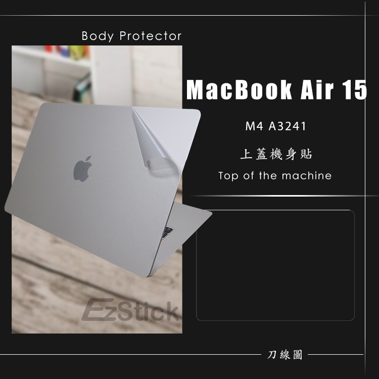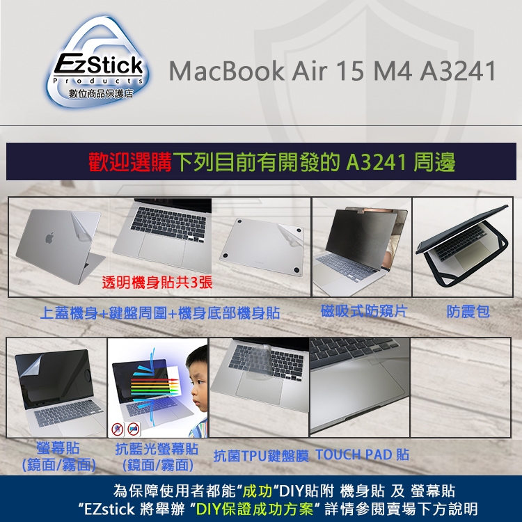 【Ezstick】MacBook Air 15 M4 A3241 筆電機身貼|霧面質感款|上蓋+鍵盤週圍+底部貼|機身貼(含上蓋+鍵盤週圍+底部貼)共三張|鏡面螢幕貼(加購價)-單購|抗藍光亮面螢幕貼(加購價)-單購|磁吸式抗藍光防窺片-單購|機身貼+觸控板貼|機身貼+筆電超細纖維布331*230mm|抗菌TPU鍵盤膜-單購Laptop Skins & CoversEZstick 3C商品保護賣場