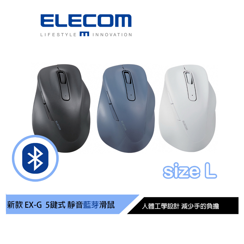【日本ELECOM】EX-G人體工學藍芽靜音5鍵式滑鼠L 黑/藍/白 適合中大手型 減少手腕負擔黑|藍|白MiceELECOM 台灣旗艦店