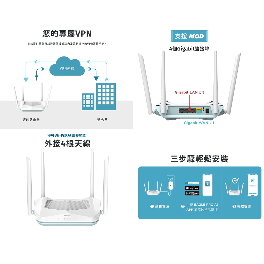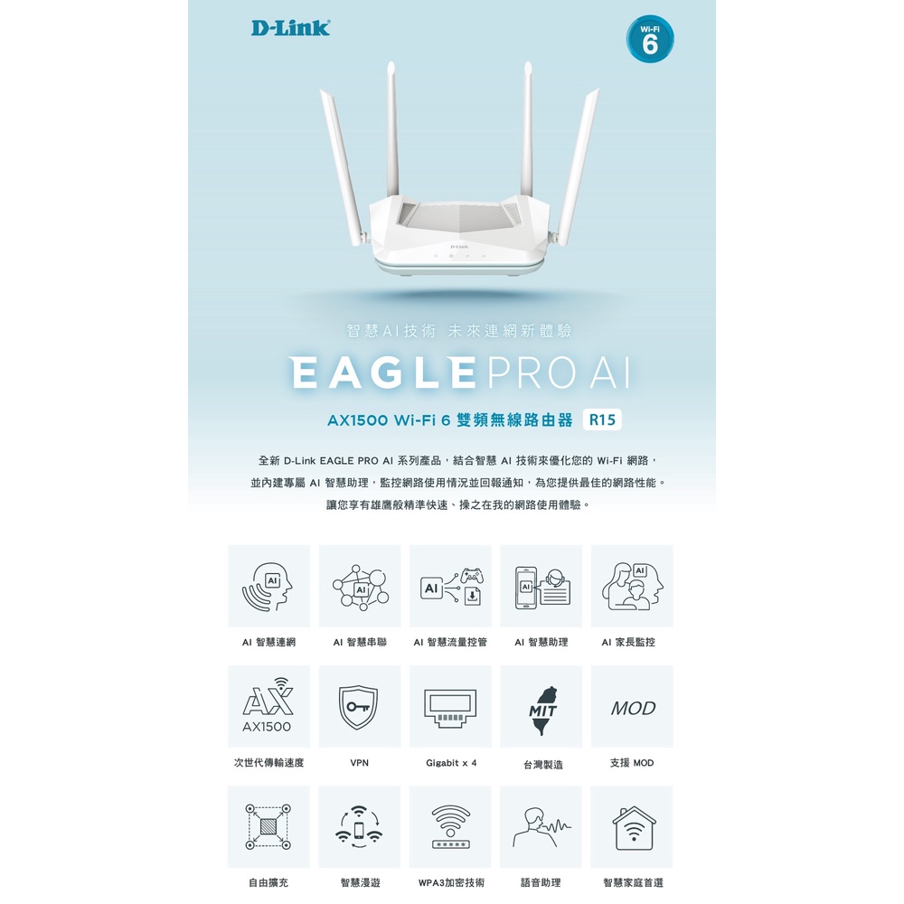 D-Link 友訊 R15 AX1500 Wi-Fi 6 雙頻無線路由器 分享器 台灣製造(新品/福利品)新品-R15Modems & Wireless RoutersD-Link官方旗艦店