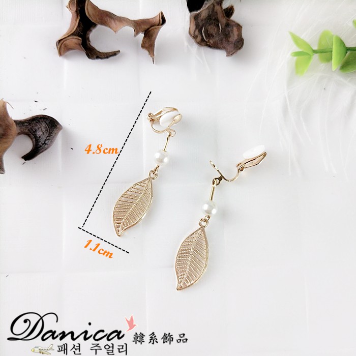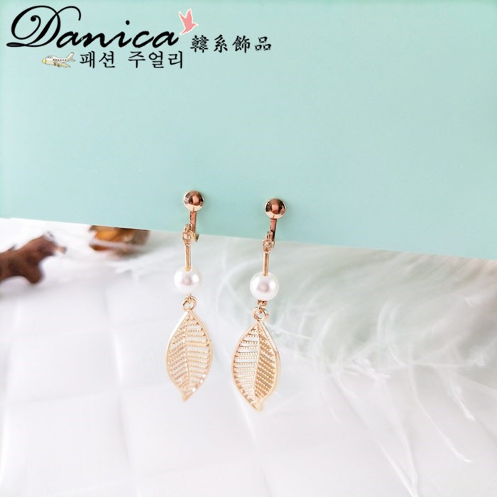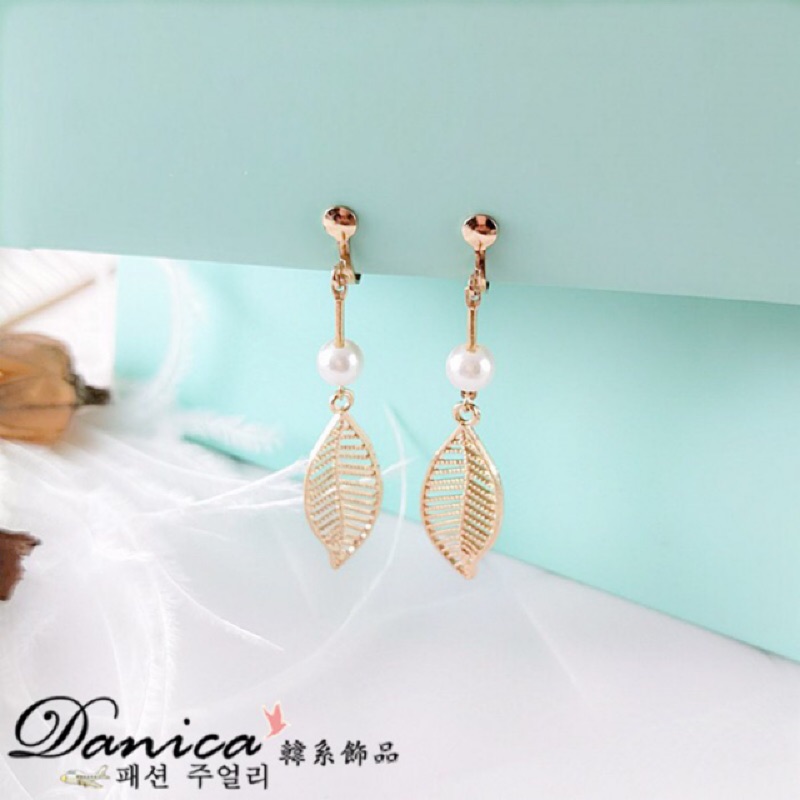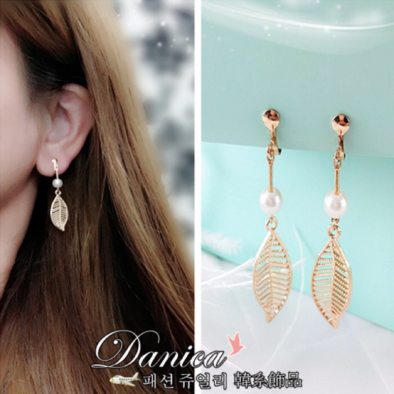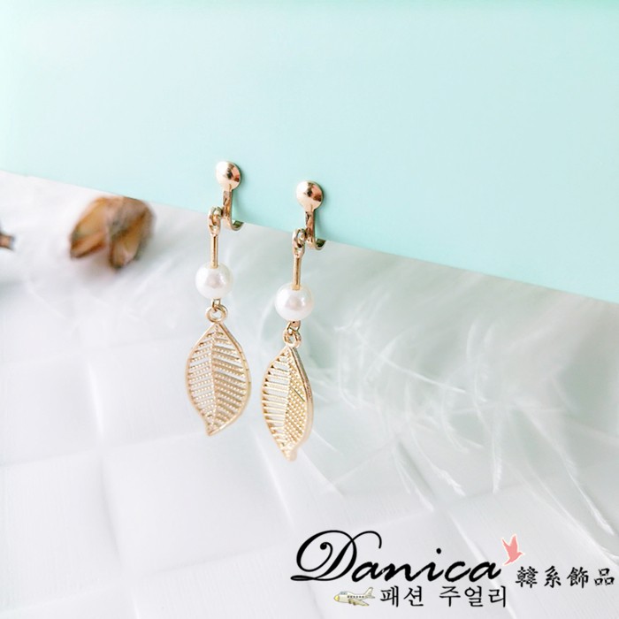 針式 夾式耳環 韓國女神氣質輕甜簡約百搭森林系葉子珍珠垂墜耳環 K91649 台灣出貨 Danica韓系飾品 韓國連線如圖夾式(無耳洞配戴)|(代改針式)Danica 韓系飾品 耳環