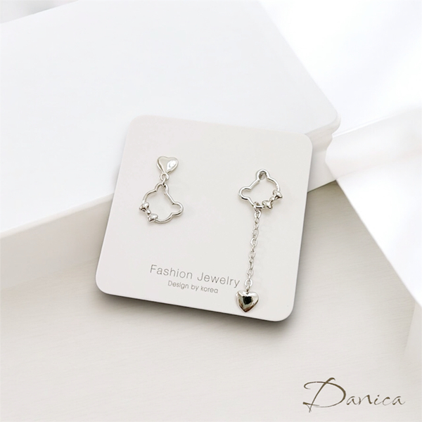 針式 夾式耳環 韓國少女氣質愛心貓咪不對稱耳環 垂墜耳環 K94265 台灣出貨 Danica 韓系飾品 韓國連線銀色針式|銀色矽膠U型夾式(無耳洞配戴)Danica 韓系飾品 耳環