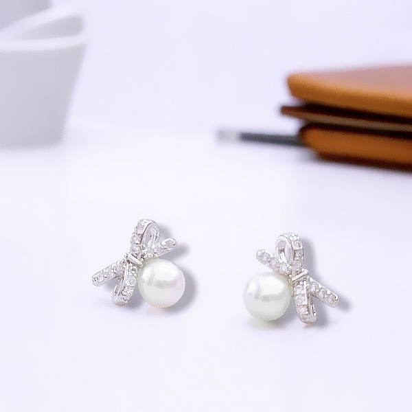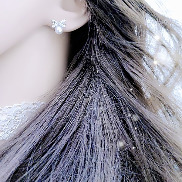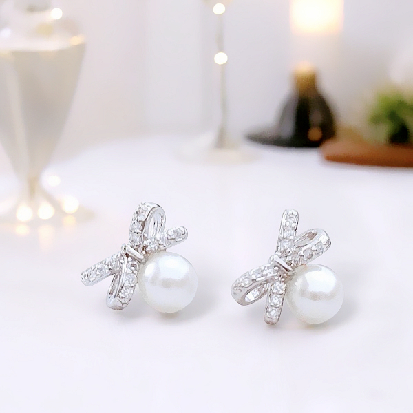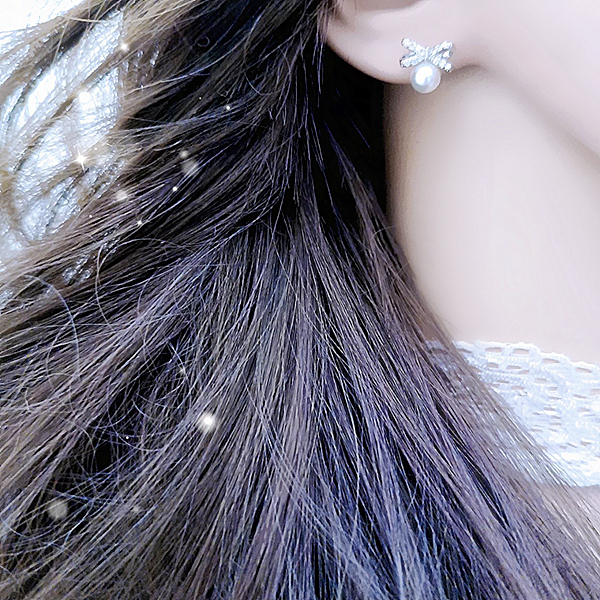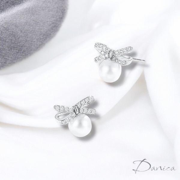 925銀針 夾式耳環 韓國女神氣質輕奢微鑲法式蝴蝶結珍珠鋯石垂墜耳環 K94292 台灣出貨 Danica 韓系飾品銀色針式|銀色矽膠U型夾式(無耳洞配戴)Danica 韓系飾品 耳環