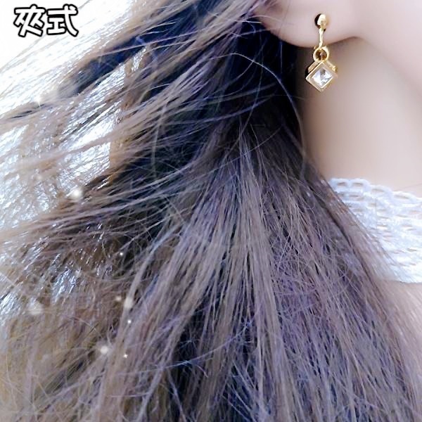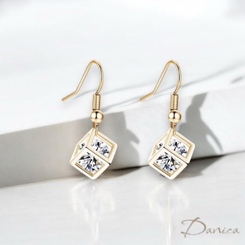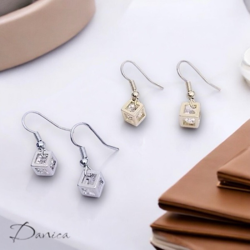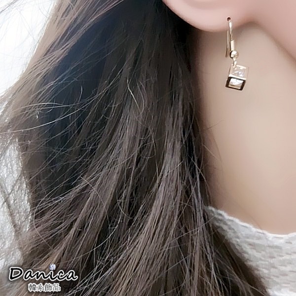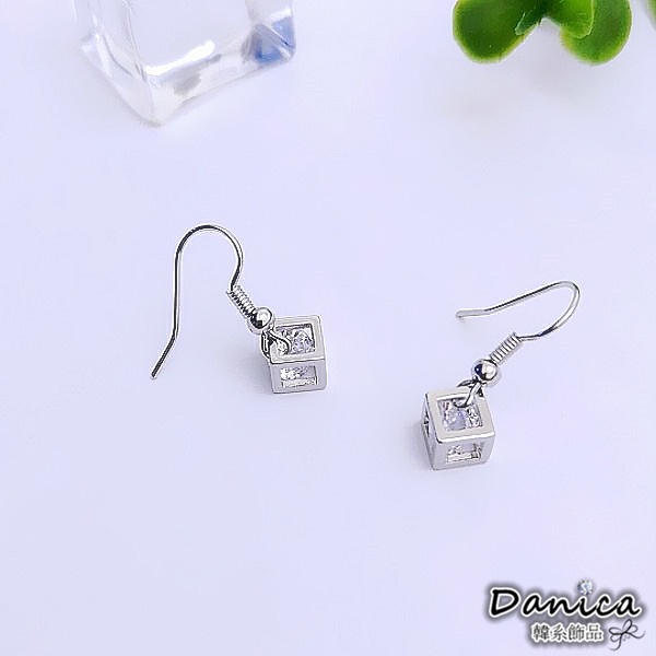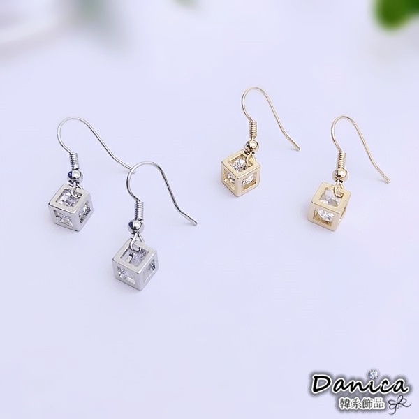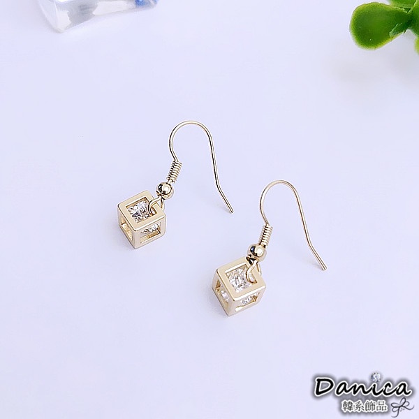 耳勾 夾式耳環 韓國女神閃亮立體簍空方塊鋯石垂墜耳環 K93920 台灣出貨 Danica 韓系飾品 韓國連線金色耳勾針式|銀色耳勾針式|金色夾式(無耳洞配戴)|銀色夾式(無耳洞配戴)Danica 韓系飾品 耳環