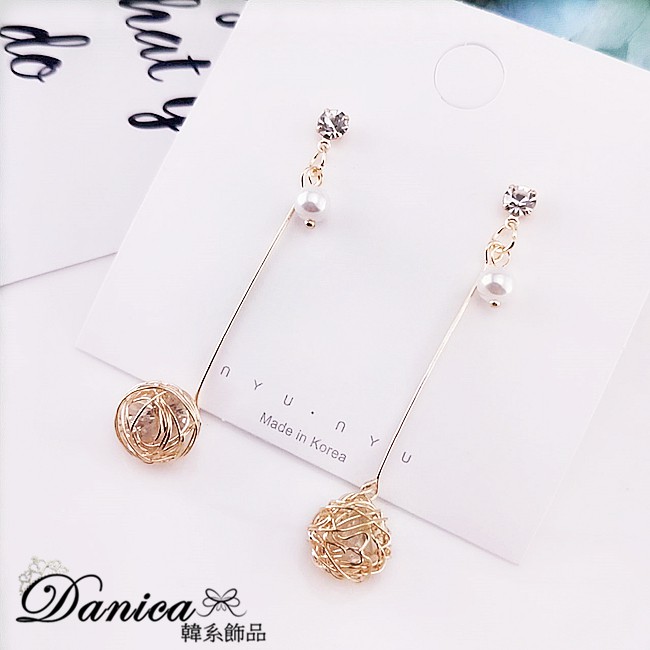 針式 夾式耳環 韓國女神浪漫百搭金線纏繞珍珠水晶垂墜耳環 K93366 台灣出貨 Danica 韓系飾品 韓國連線針式|夾式(無耳洞配戴)Danica 韓系飾品 耳環