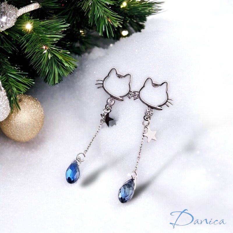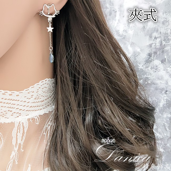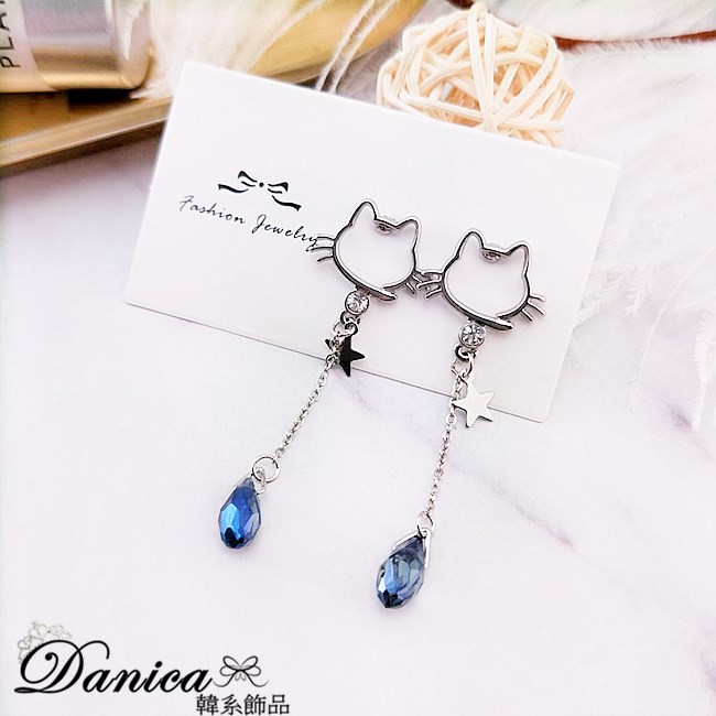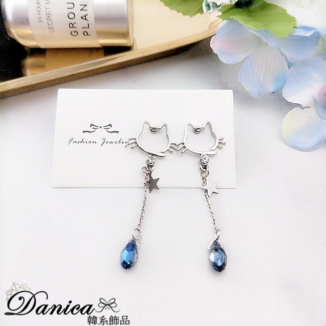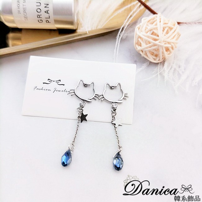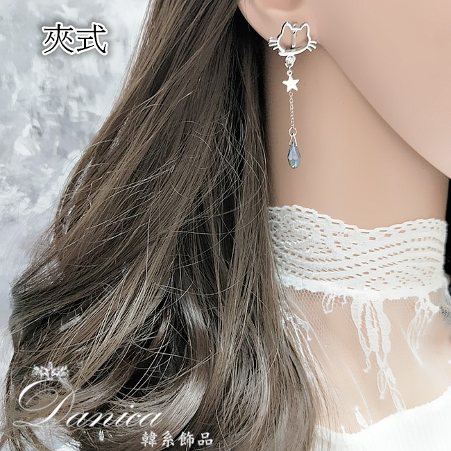 925銀針 夾式耳環 韓國少女心氣質甜美百搭簍空貓咪水晶流蘇耳環 K93502 台灣出貨 Danica 韓系飾品針式|夾式(無耳洞配戴)Danica 韓系飾品 耳環