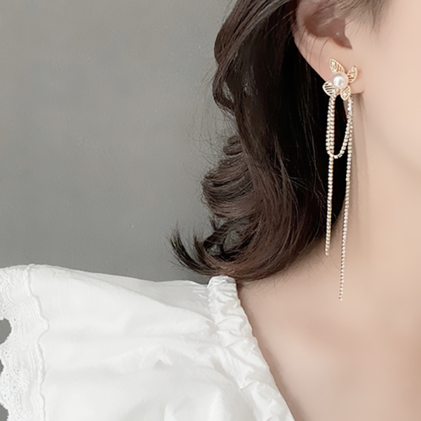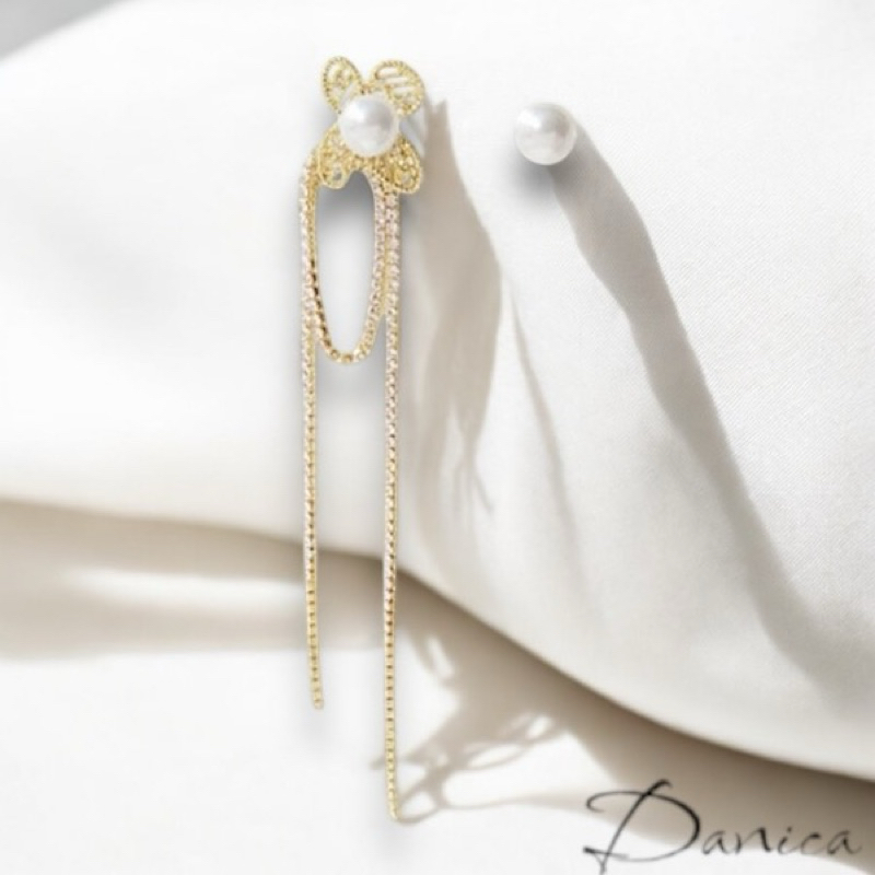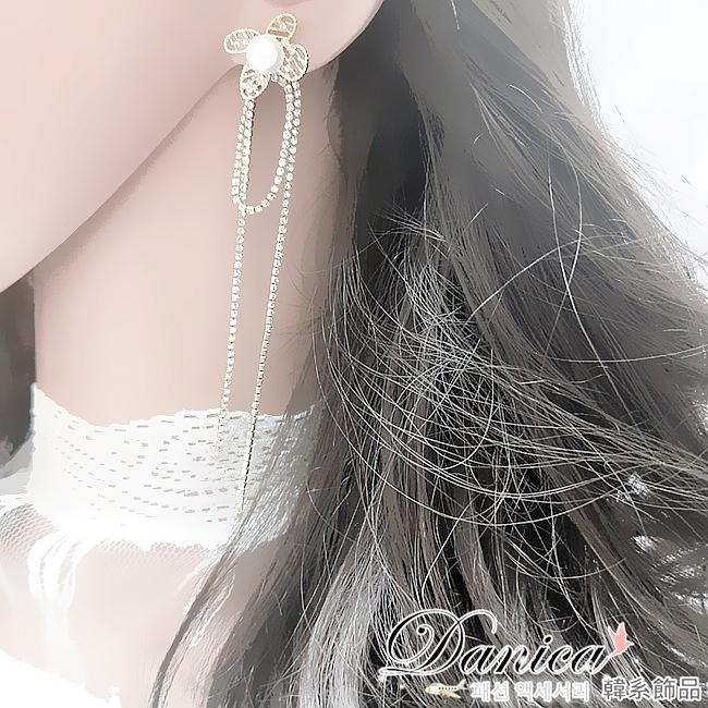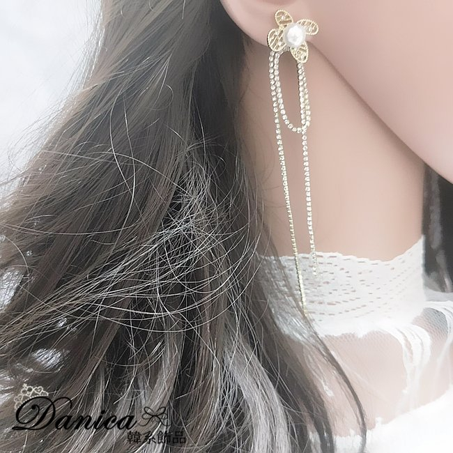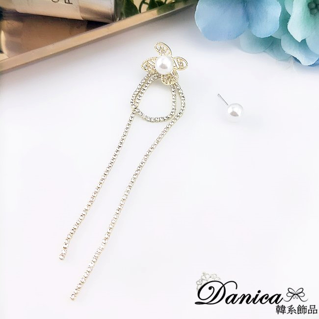 925銀針 韓國女神氣質浪漫花朵水鑽珍珠不對稱耳環 流蘇耳環 K93778 台灣出貨 Danica 韓系飾品金色不對稱針式Danica 韓系飾品 耳環