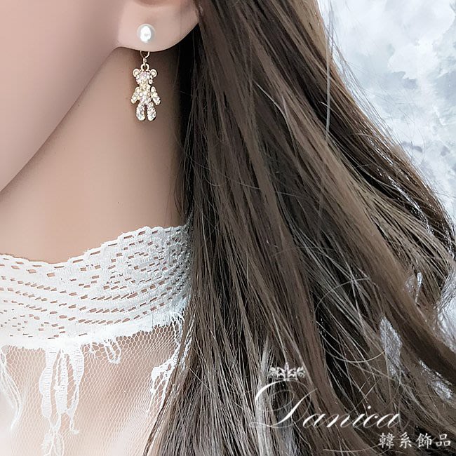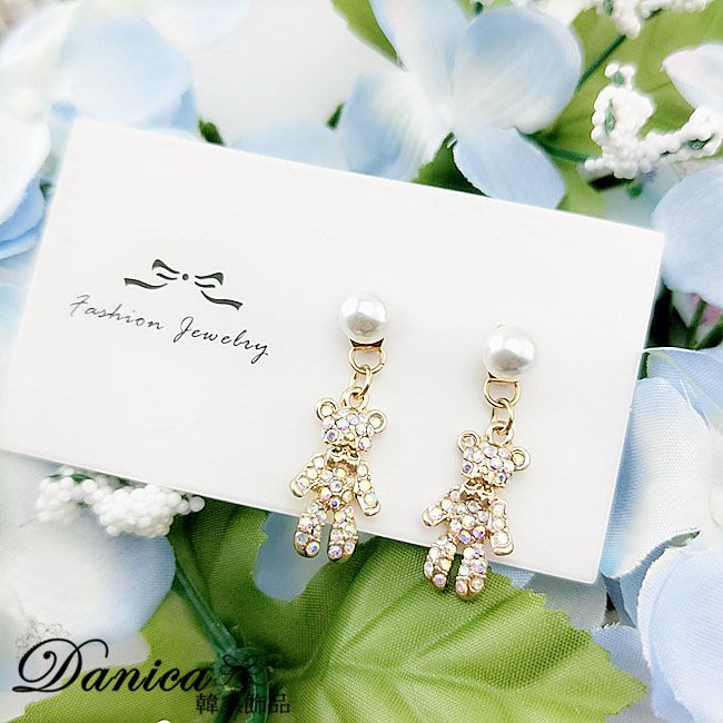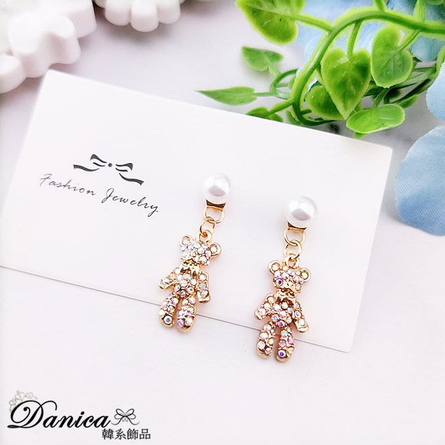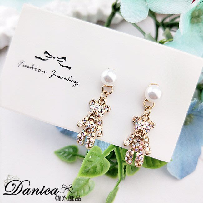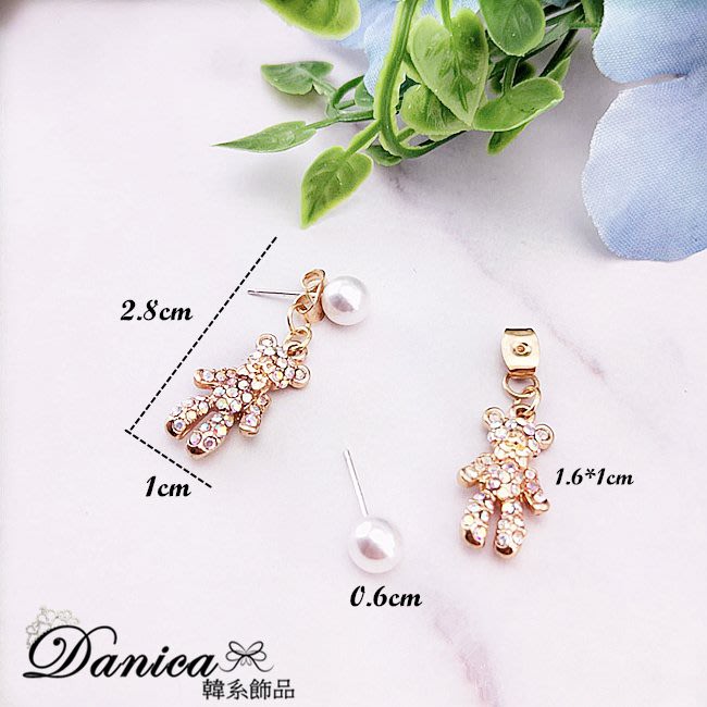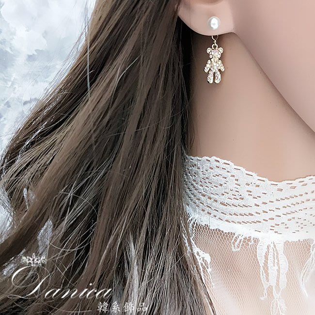 925銀針 夾式耳環 韓國少女氣質珍珠滿鑽熊熊後掛耳環 K93486 台灣出貨 Danica 韓系飾品 韓國連線如圖針式|金球螺旋夾式(無耳洞配戴)Danica 韓系飾品 耳環