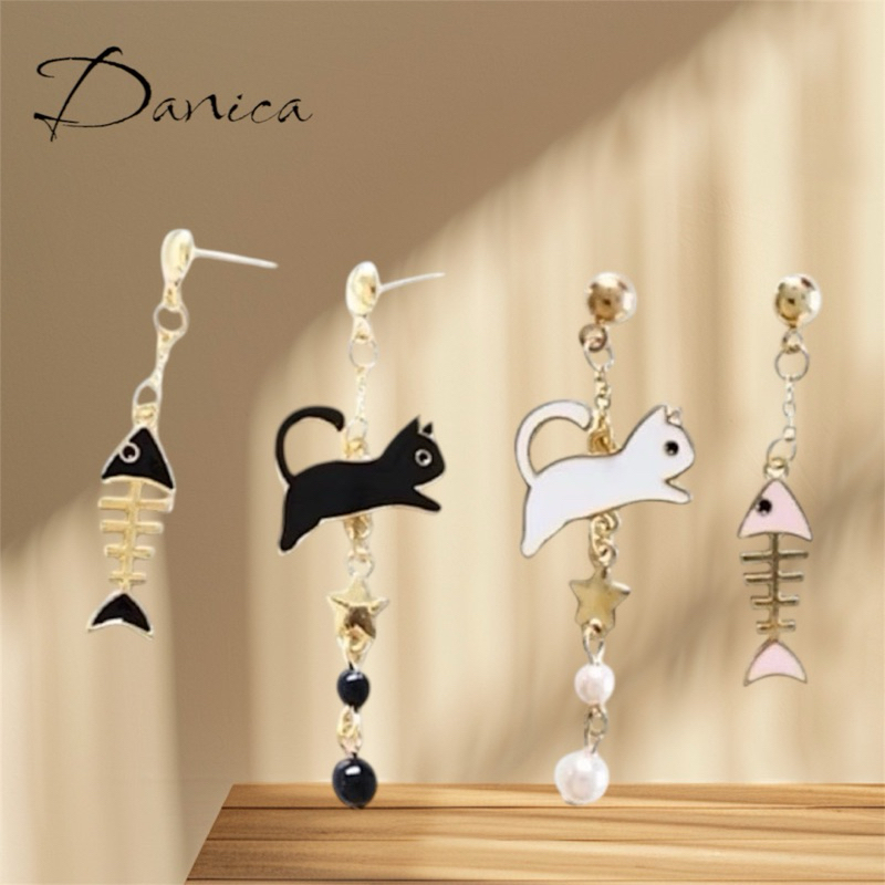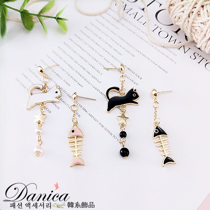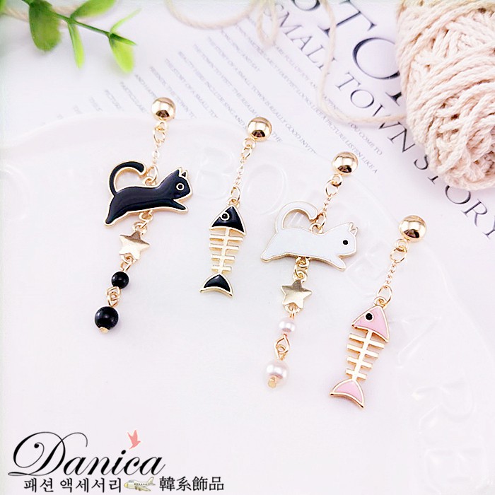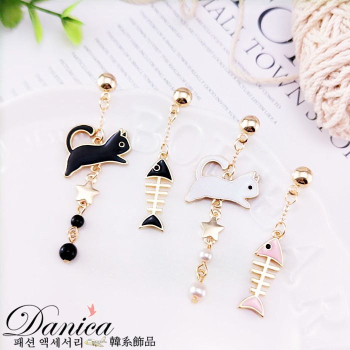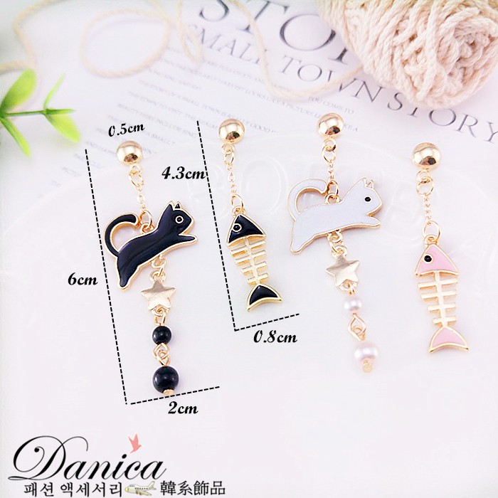 925銀針 夾式耳環 韓國少女氣質甜美萌系貓咪與魚骨頭不對稱耳環 K92976 台灣出貨 Danica 韓系黑貓不對稱針式|白貓不對稱針式|黑貓不對稱夾式(無耳洞配戴)|白貓不對稱夾式(無耳洞配戴)Danica 韓系飾品 耳環