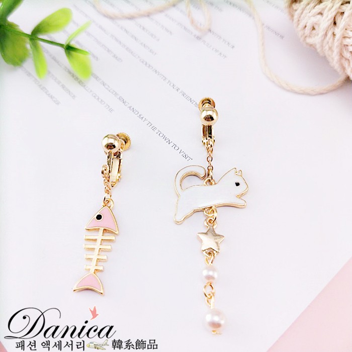 925銀針 夾式耳環 韓國少女氣質甜美萌系貓咪與魚骨頭不對稱耳環 K92976 台灣出貨 Danica 韓系