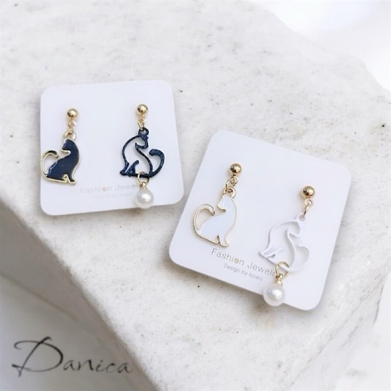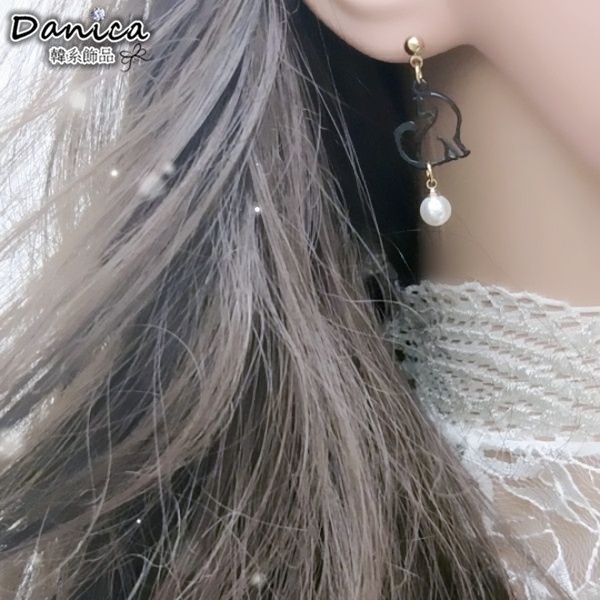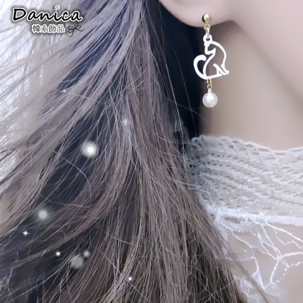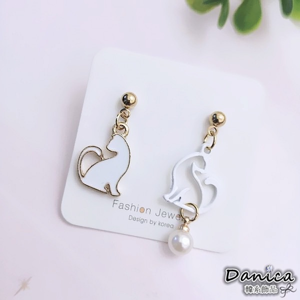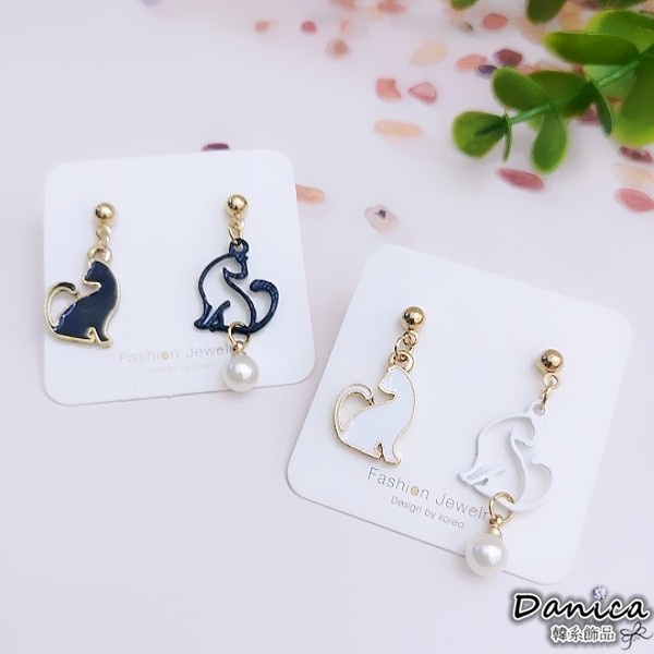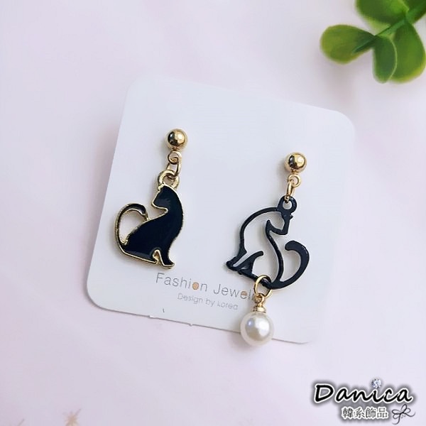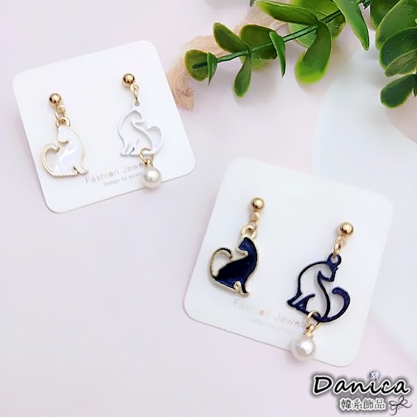 貓咪耳環 針式 夾式耳環 韓國少女超萌簍空貓咪珍珠不對稱耳環 垂墜耳環 93932 台灣出貨 Danica 韓系飾品黑色不對稱針式|白色不對稱針式|黑色不對稱夾式(無耳洞配戴)|白色不對稱夾式(無耳洞配戴)Danica 韓系飾品 耳環