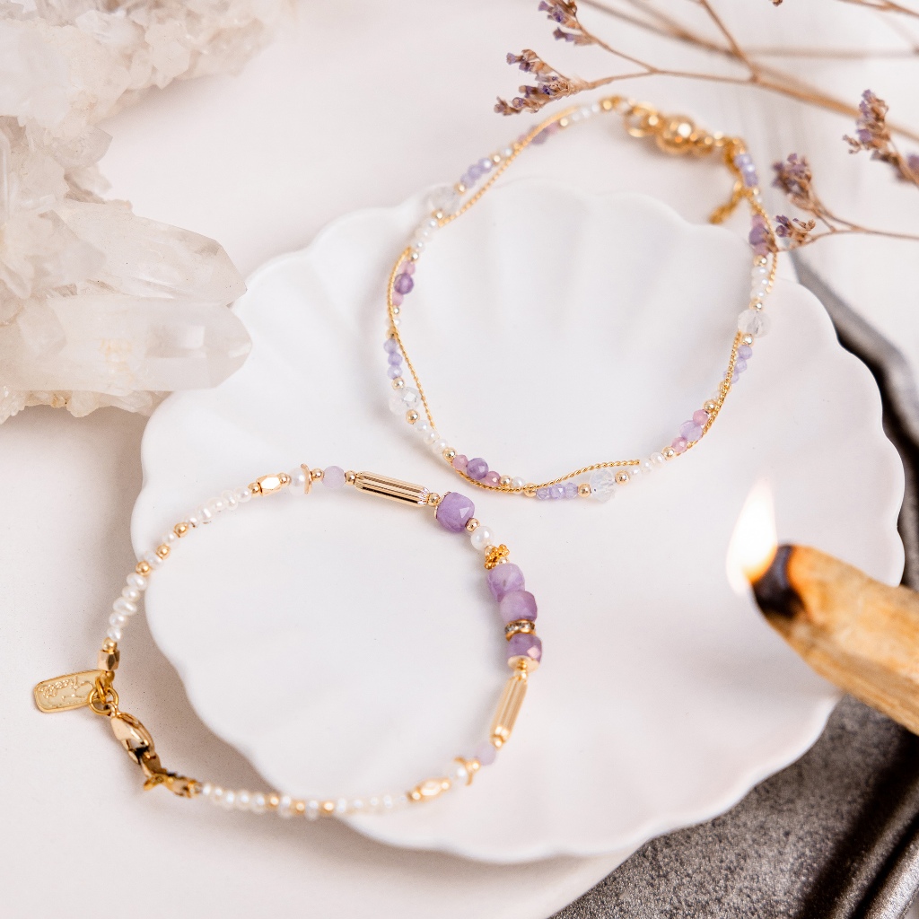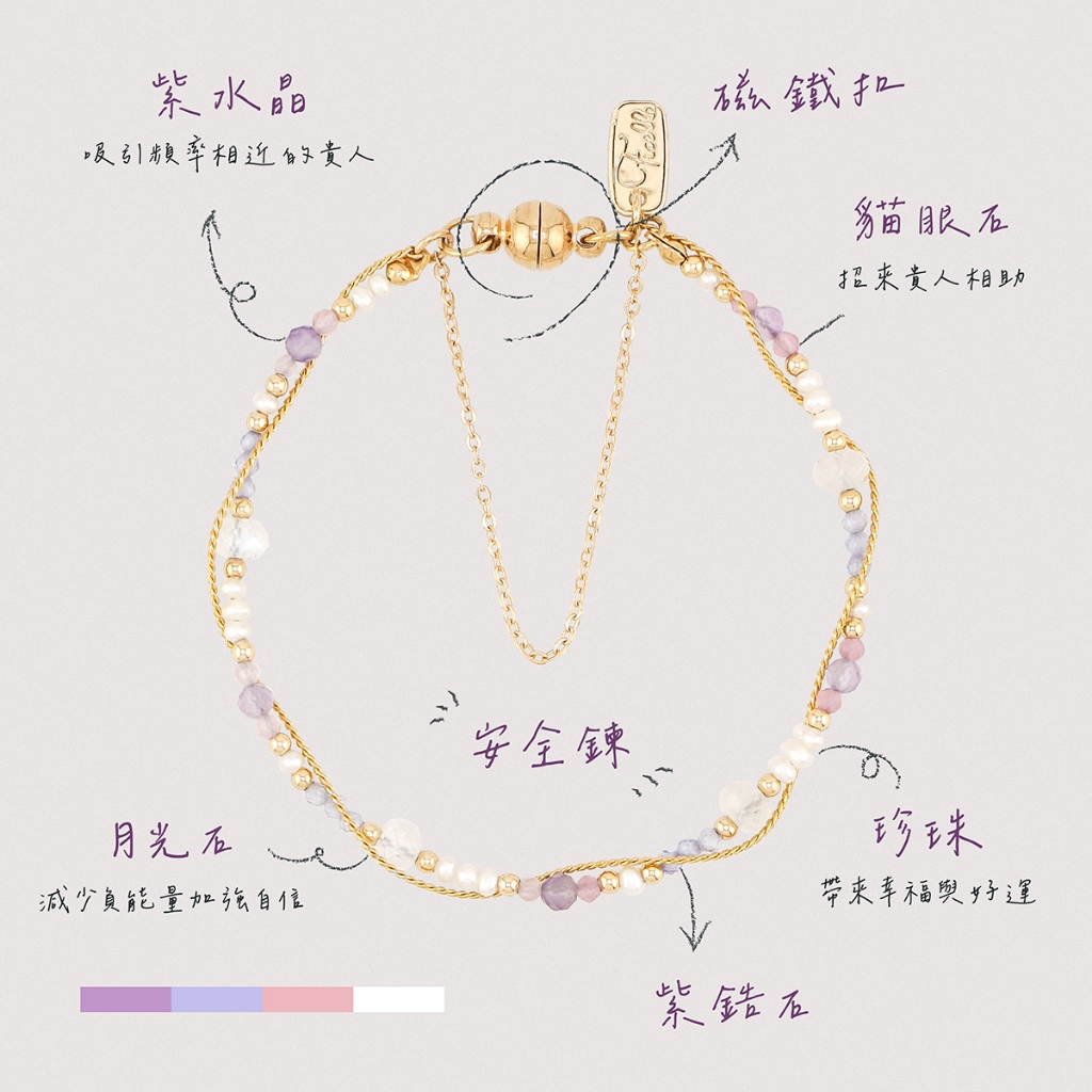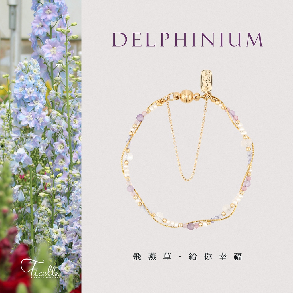 【Ficelle輕珠寶】二月誕生石 • 飛燕草 • 給你幸福|紫水晶 月光石 珍珠 粉貓眼石 黃銅鍍18K金 磁扣 手鍊13cm(兒童尺寸請慎選)|14cm|15cm|16cm|17cm|18-25cm,尺寸請填於備註Ficelle手作輕珠寶