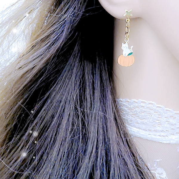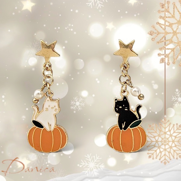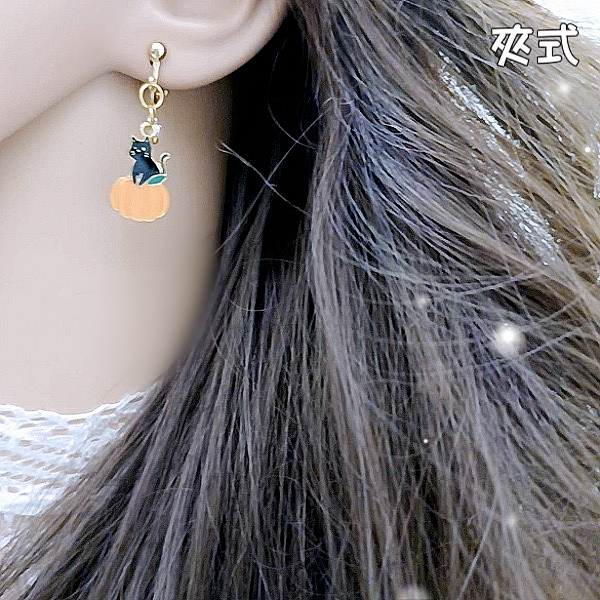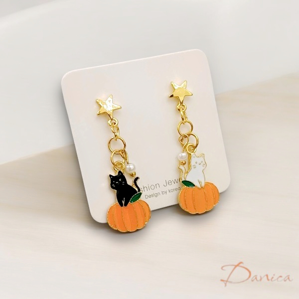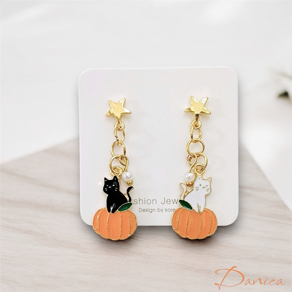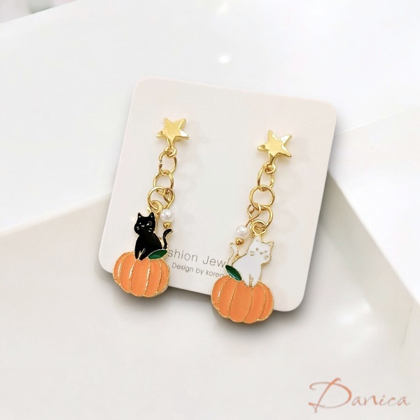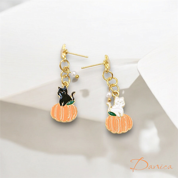 925銀針 夾式耳環 韓國少女心南瓜黑白貓咪珍珠不對稱耳環 K94271 台灣出貨 Danica 韓系飾品 韓國連線如圖不對稱針式|金球螺旋夾式(無耳洞配戴)Danica 韓系飾品 耳環