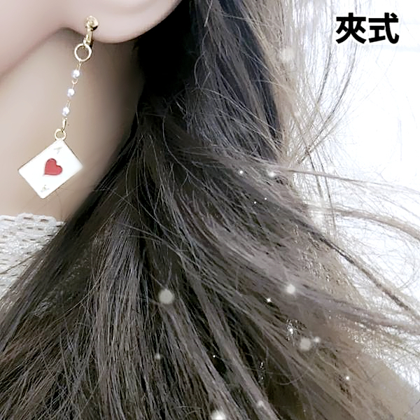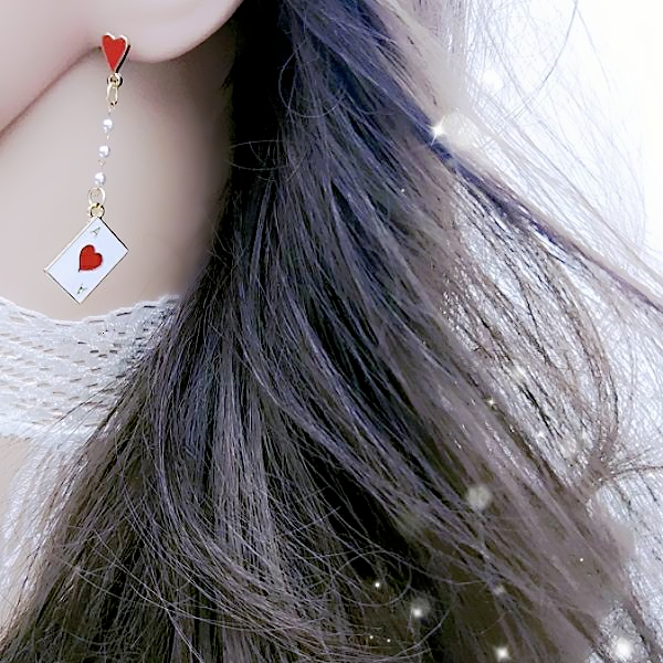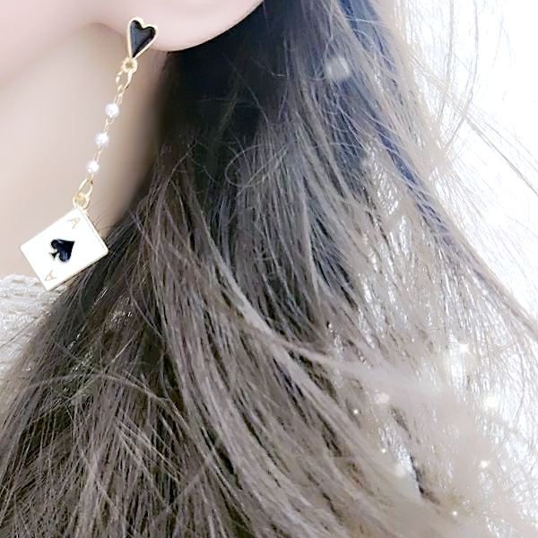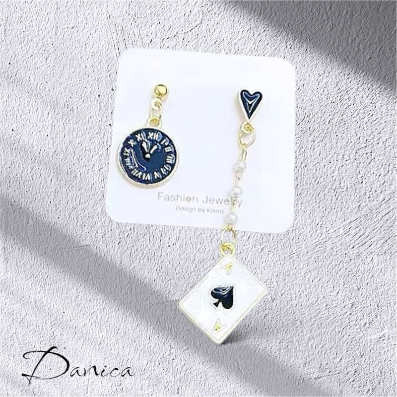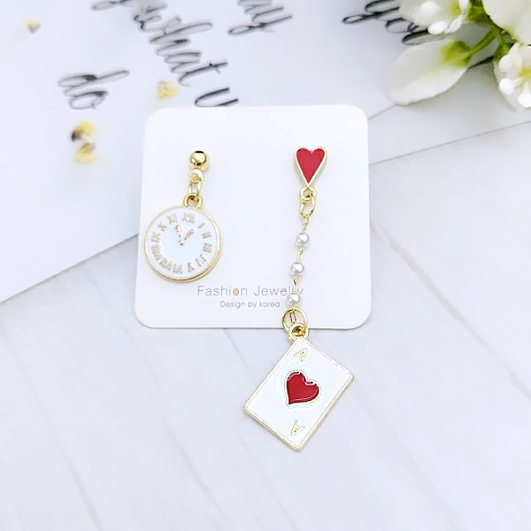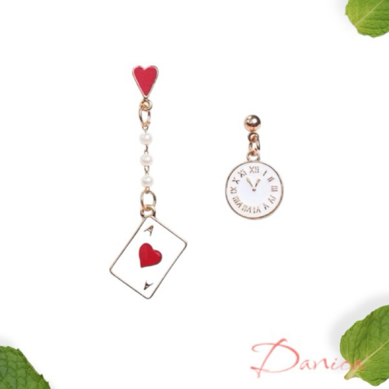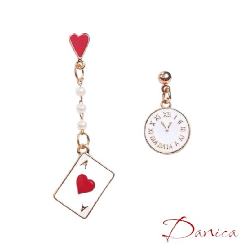 針式 夾式耳環 韓國少女愛麗絲撲克牌時鐘珍珠不對稱耳環 垂墜耳環 K92956 台灣出貨 Danica 韓系飾品如圖紅心A不對稱針式|如圖紅心A不對稱夾式(無耳洞配戴)|黑桃A不對稱針式|黑桃A不對稱夾式(無耳洞配戴)Danica 韓系飾品 耳環