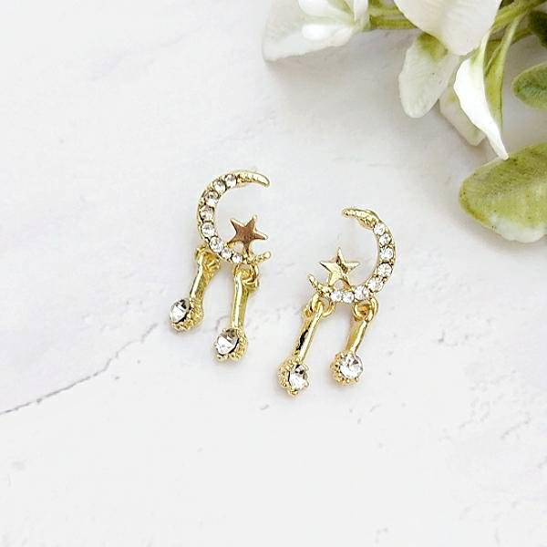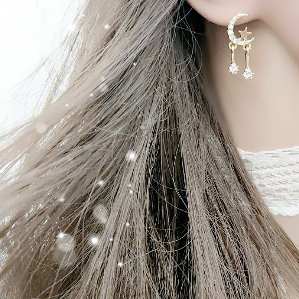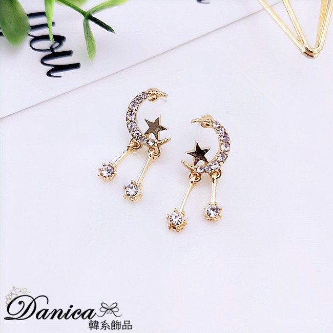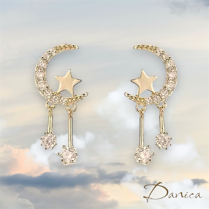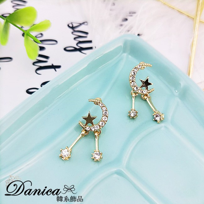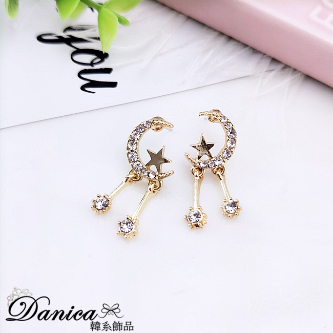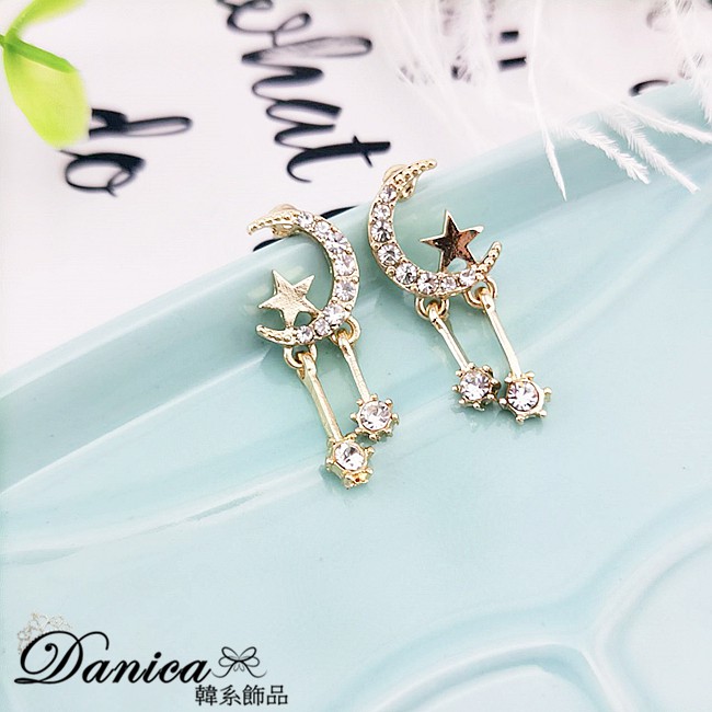 925銀針 夾式耳環 韓國女神氣質甜美百搭星星月亮水鑽垂墜耳環 K93324 台灣出貨 Danica 韓系飾品金色針式|金色矽膠U型夾式(無耳洞配戴)Danica 韓系飾品 耳環