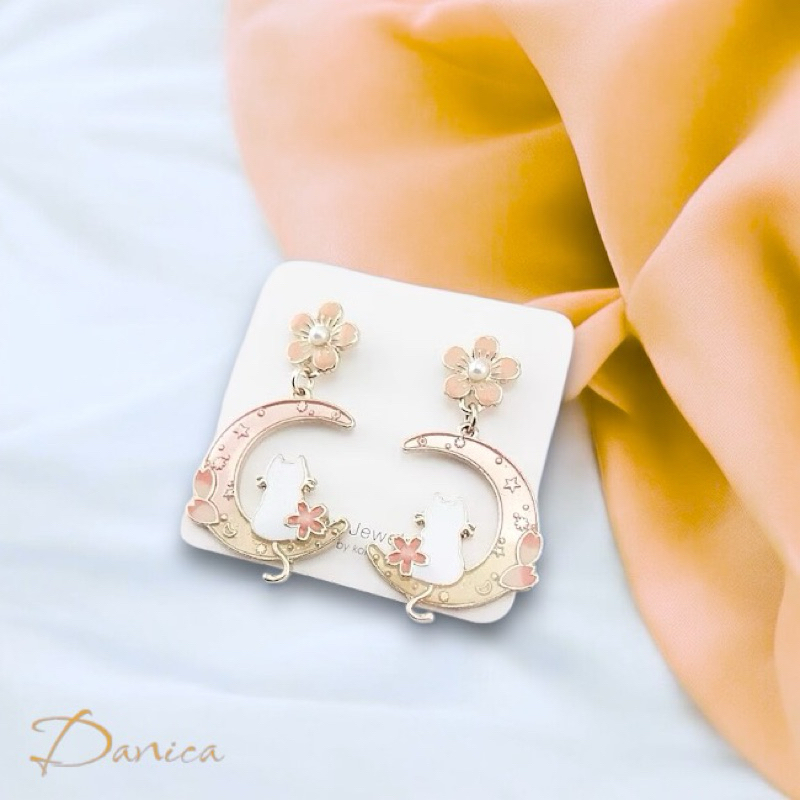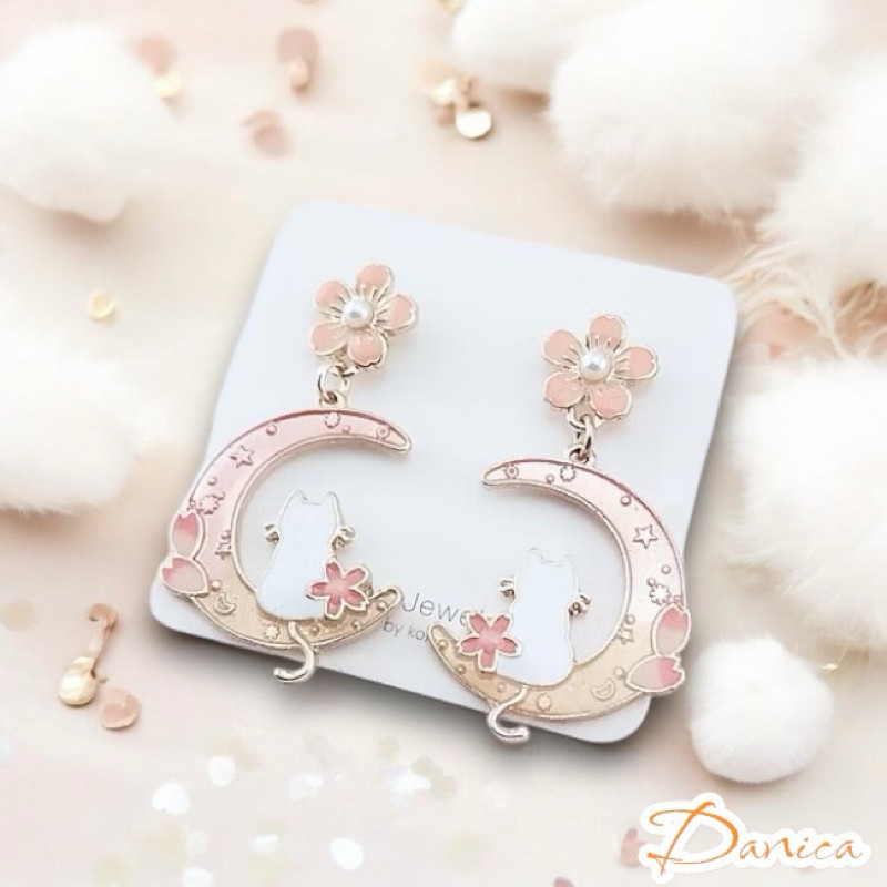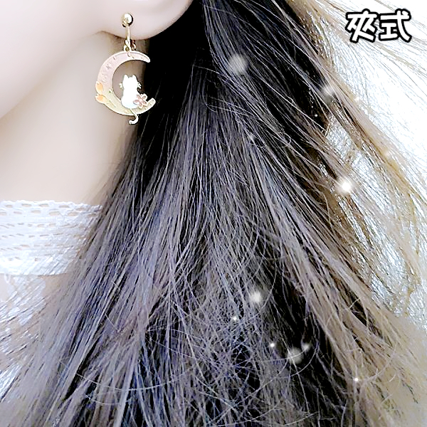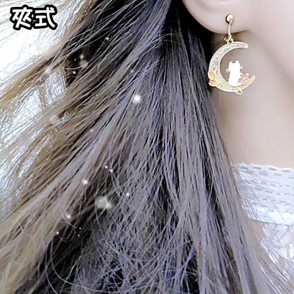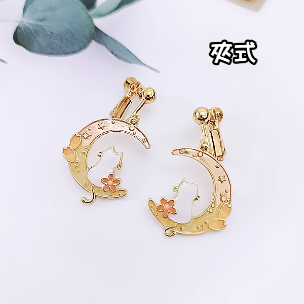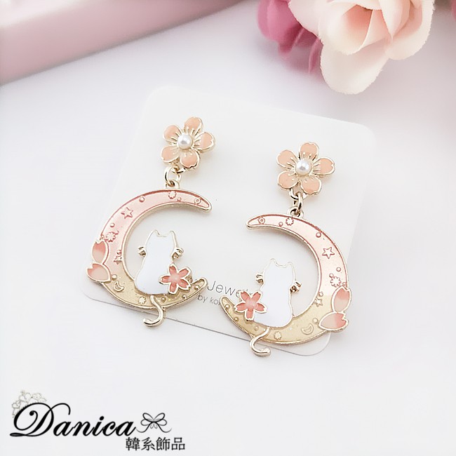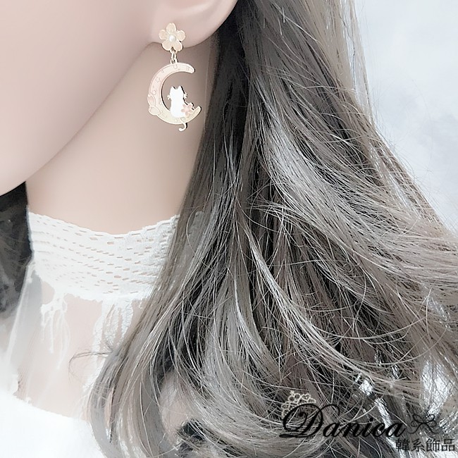 925銀針 夾式耳環 韓國少女氣質甜美花朵月亮曬貓咪垂墜耳環 K93700 台灣出貨 Danica 韓系飾品 韓國連線如圖針式|金球螺旋夾式(無耳洞配戴)Danica 韓系飾品 耳環
