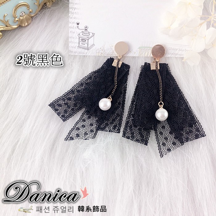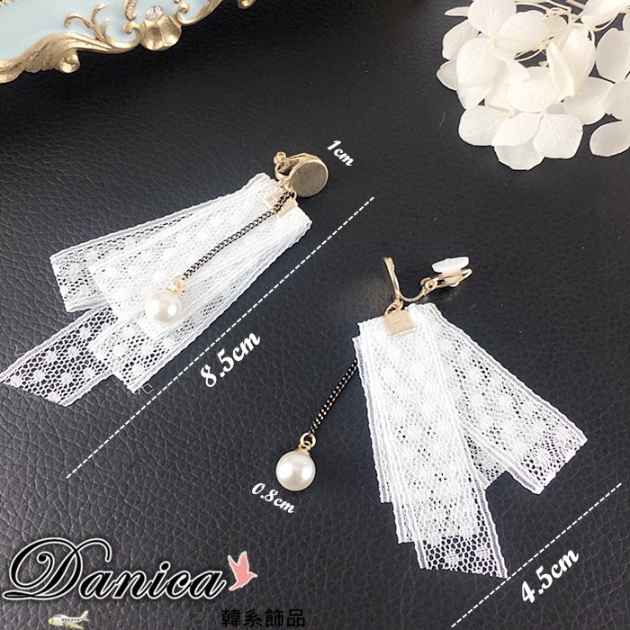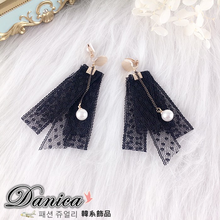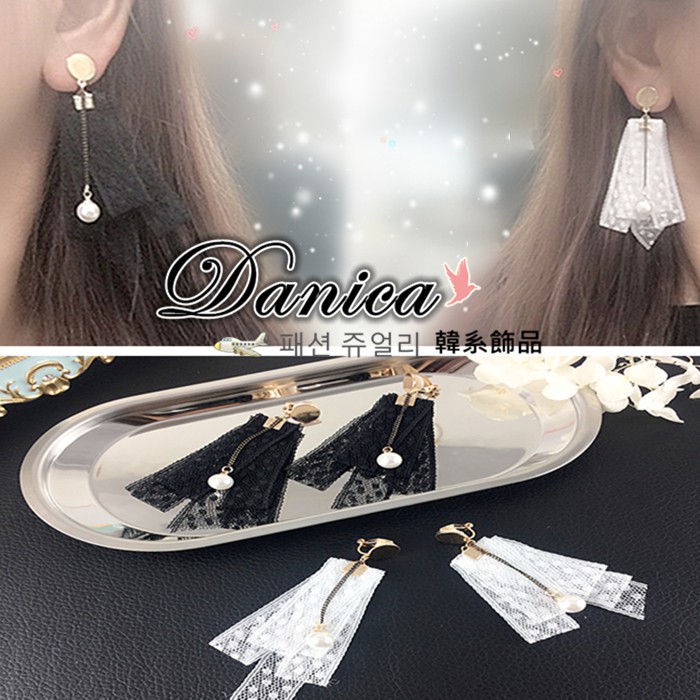 夾式耳環 韓國女神氣質甜美公主風蕾絲點點緞帶珍珠流蘇垂墜夾式耳環 K91451 批發價 Danica 韓系飾品1號白色夾式(無耳洞配戴)|2號黑色夾式(無耳洞配戴)Danica 韓系飾品 耳環