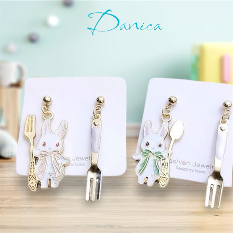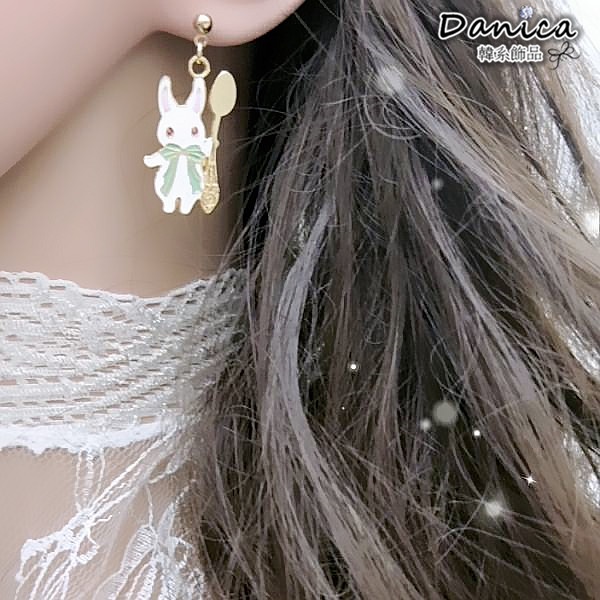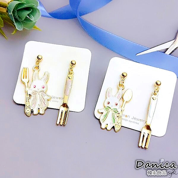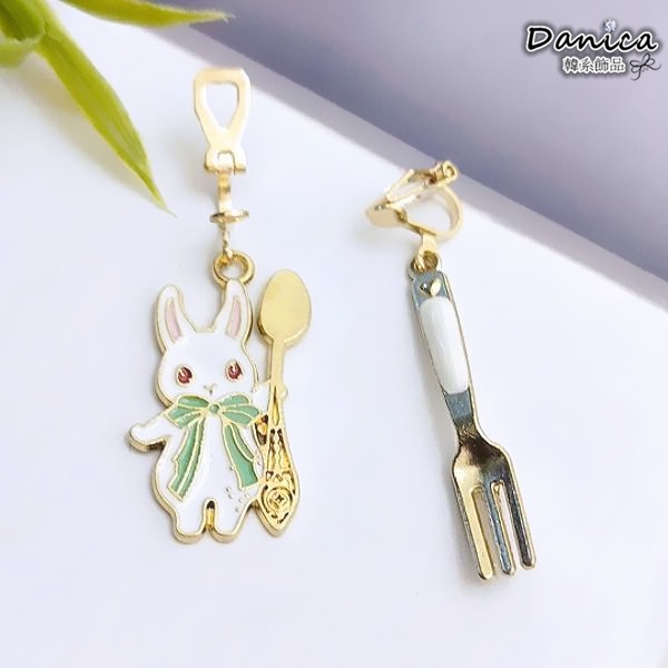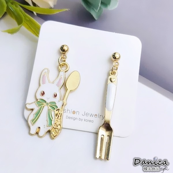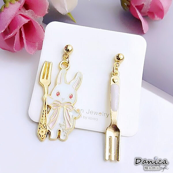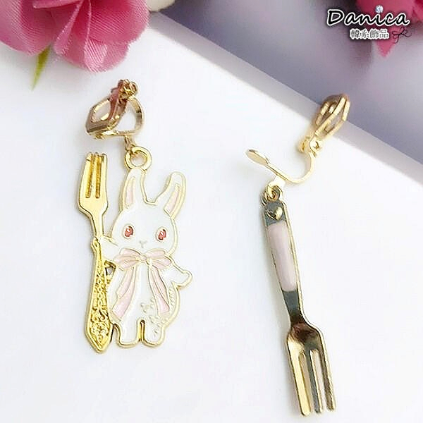 針式 夾式耳環 韓國少女童趣可愛兔子與叉子不對稱耳環 垂墜耳環 K93951 台灣出貨 Danica 韓系飾品韓國連線