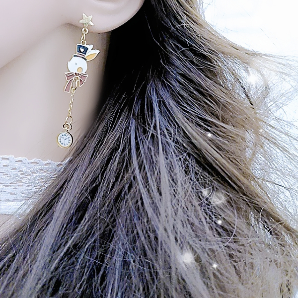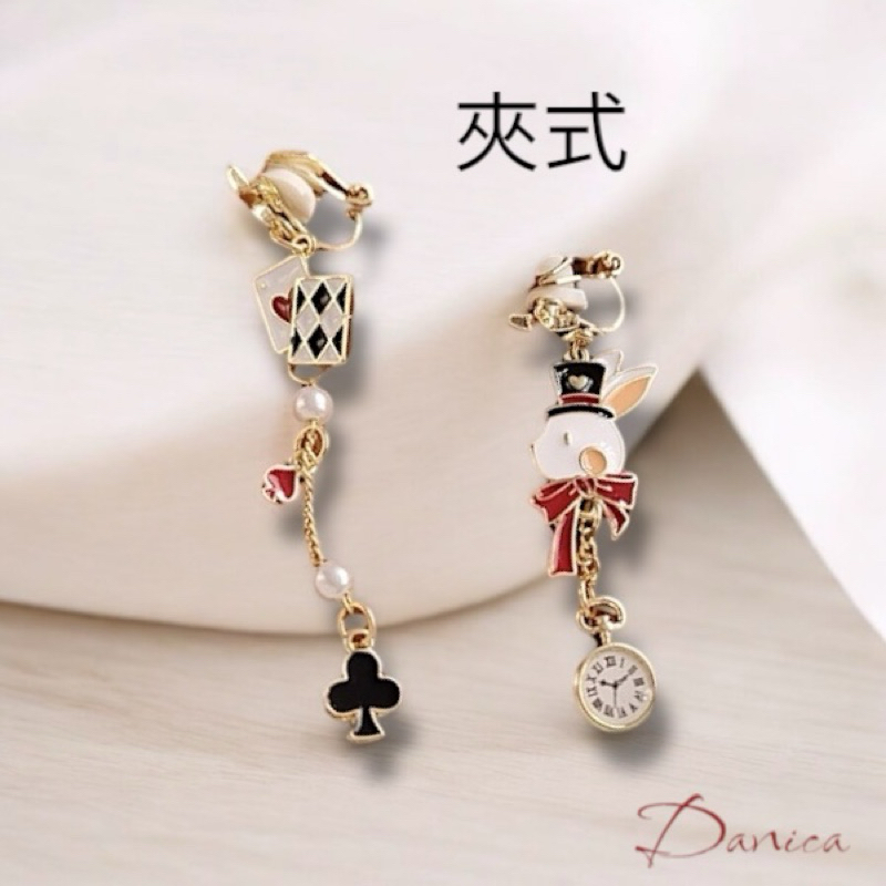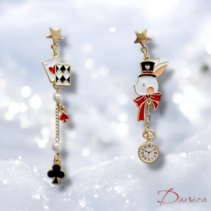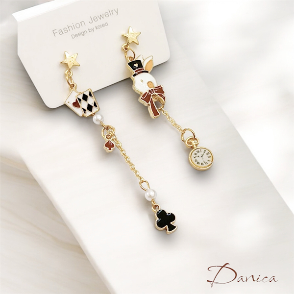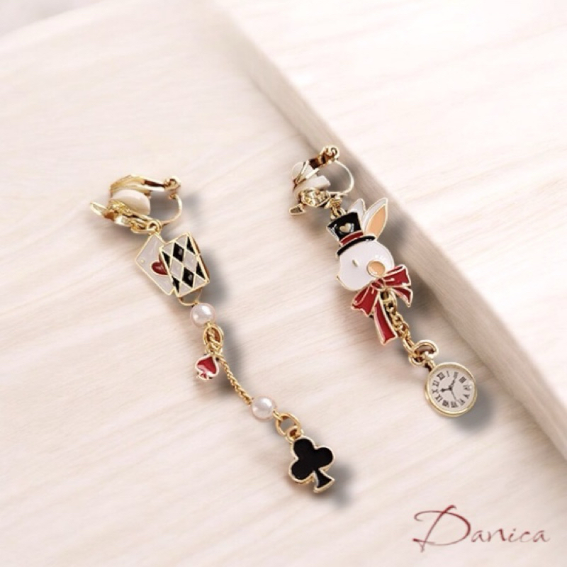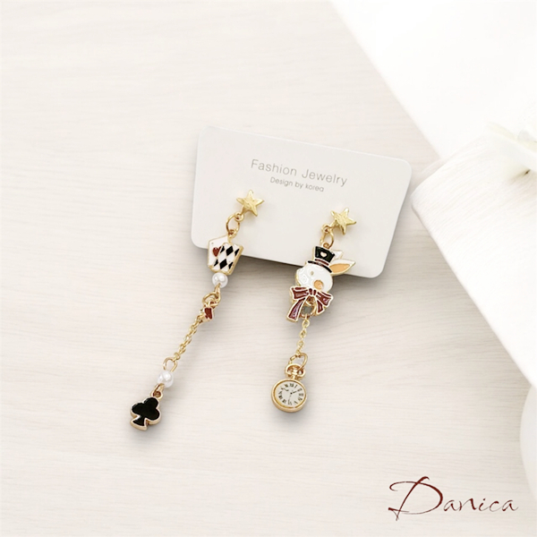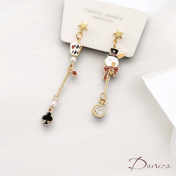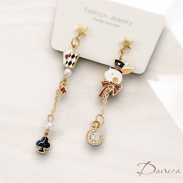 針式 夾式耳環 韓國少女心兔子撲克牌時鐘珍珠不對稱耳環 垂墜耳環 K94270 台灣出貨 Danica 韓系飾品 韓國連金色不對稱針式|金色夾式(無耳洞配戴)Danica 韓系飾品 耳環