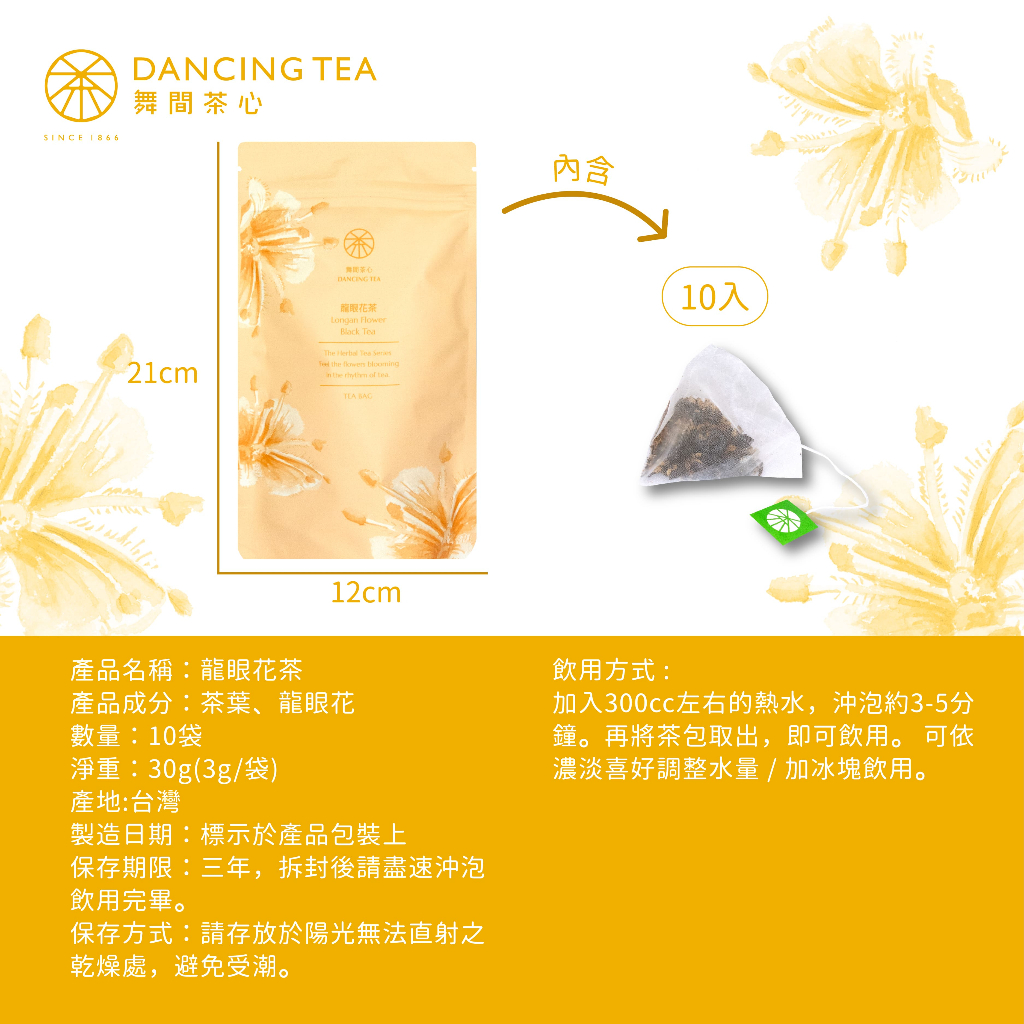 【舞間茶心】龍眼花茶|三角立體茶包10入|SGS合格驗證|龍眼花茶包|原片原葉|冷泡茶|花蓮茶 花茶 紅茶包 蜂蜜紅茶【舞間茶心】龍眼花茶|三角立體茶包10入|SGS合格驗證|龍眼花茶包|原片原葉|冷泡茶|花蓮茶 花茶 紅茶包 蜂蜜紅茶Tea & Tea BagsDancingTea舞間茶心|甜點烘焙店指定茶粉品牌|烘焙老師推薦|爆米花冰淇淋